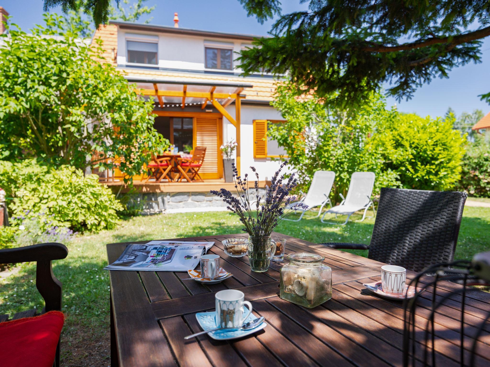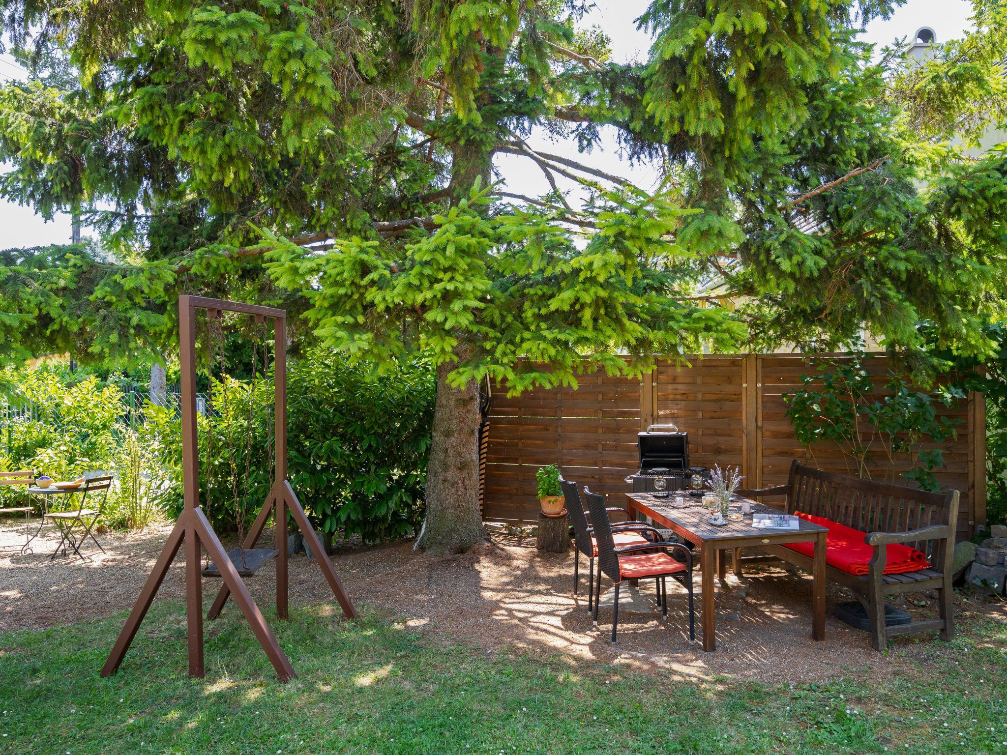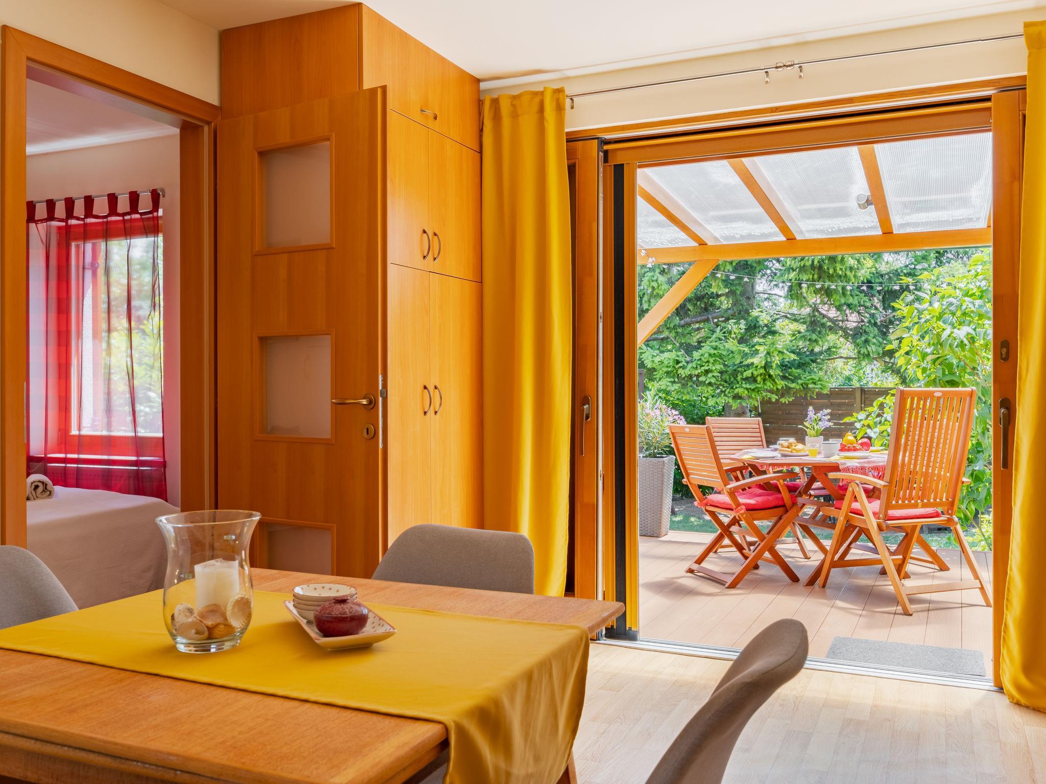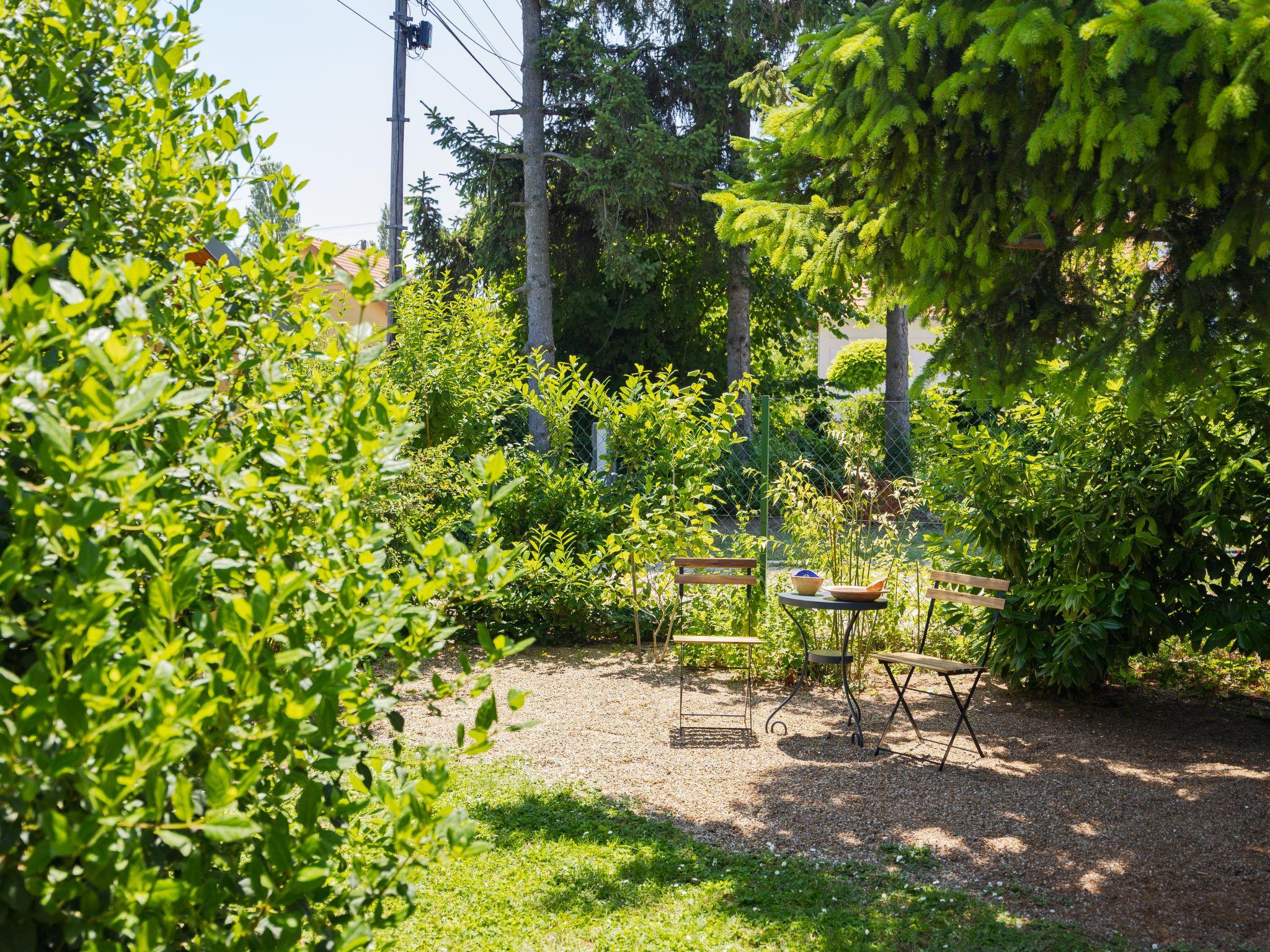 Balatonakali 15 km from Balatonfüred: Cosy, comfortable semi-detached house "Clarissa", 2 storeys. In the resort, 200 m from the lake, 1 km from the beach. Private: property (fenced), garden (not fenced) flowers and trees. (swing). In the house: WiFi, central heating system, air conditioning, washing machine. Parking on the premises. Supermarket 550 m, restaurant 280 m, bakery, café 550 m, bicycle rental 900 m, bus stop "Balatonakali, bejárati út" 400 m, railway station "Balatonakali-Dörgicse" 650 m, thermal baths "Hévíz" 52 km. Marina 400 m, golf course (18 hole) 6 km, tennis 4 km, indoor tennis centre 14 km, riding stable 15 km, sports centre 14 km, cycle lane 50 m, children's playground 350 m. Nearby attractions: Balatonudvari Golf Club 60 km, Tihany templom 13 km, Balatonfüred Annagora Aquapark 14 km, Badacsony 25 km, Folly Arboretum 20 km, Veszprém Zoo 40 km. Please note: baby equipment on request (included). The owner does not accept any youth groups. The keys‘ handover takes place by the agency Interhome in Balatonfüred, 15 km. Railway line closeby 100 m from the property.