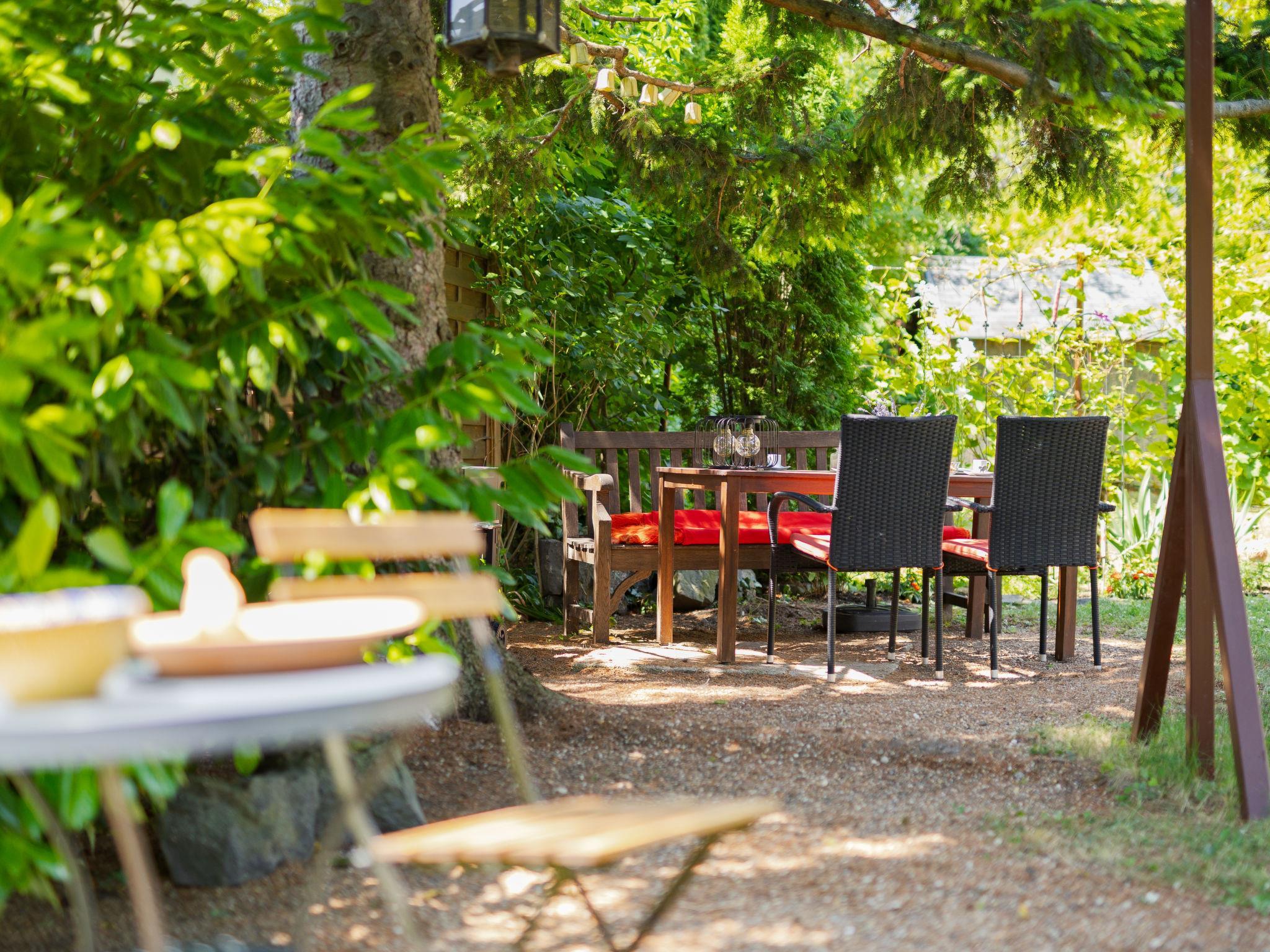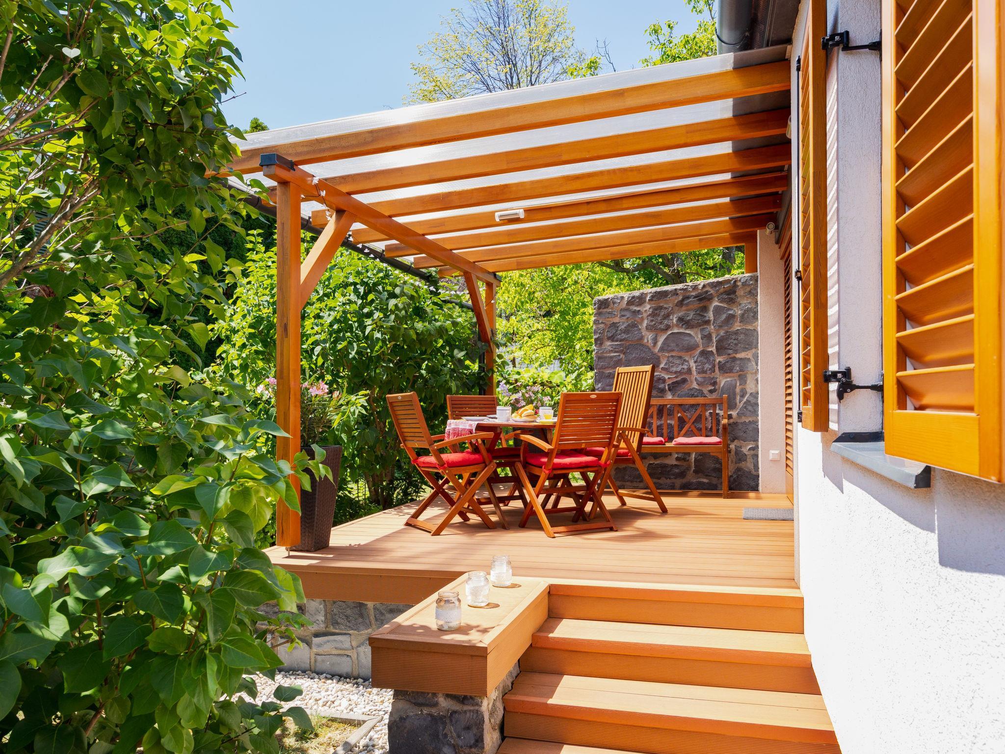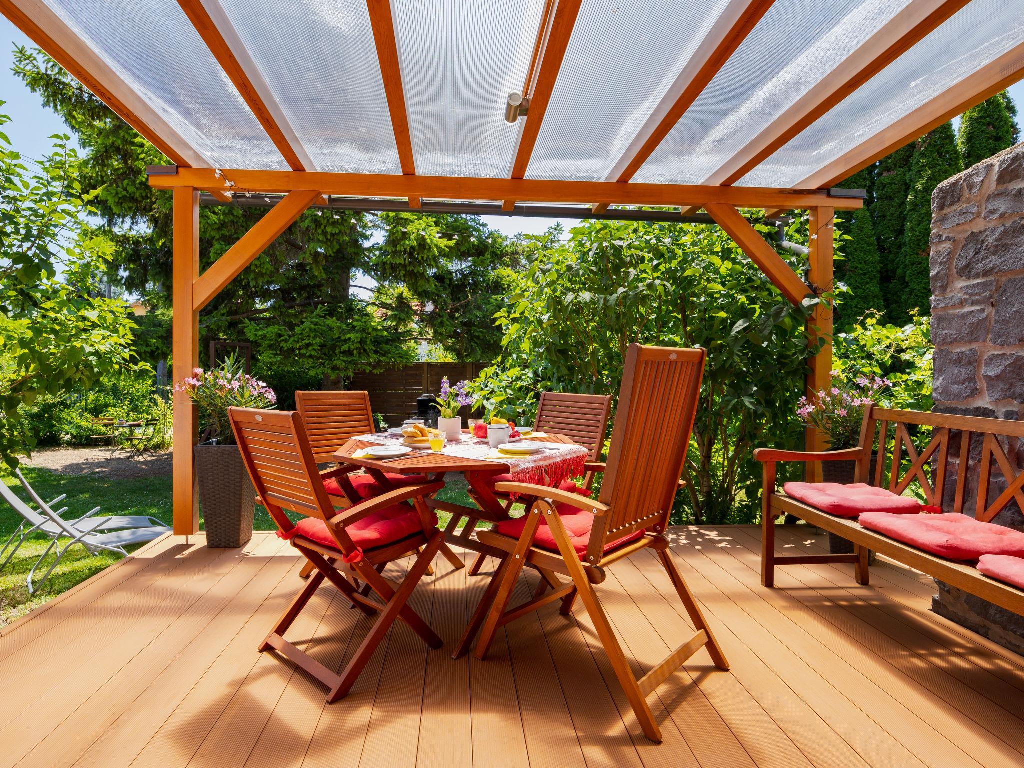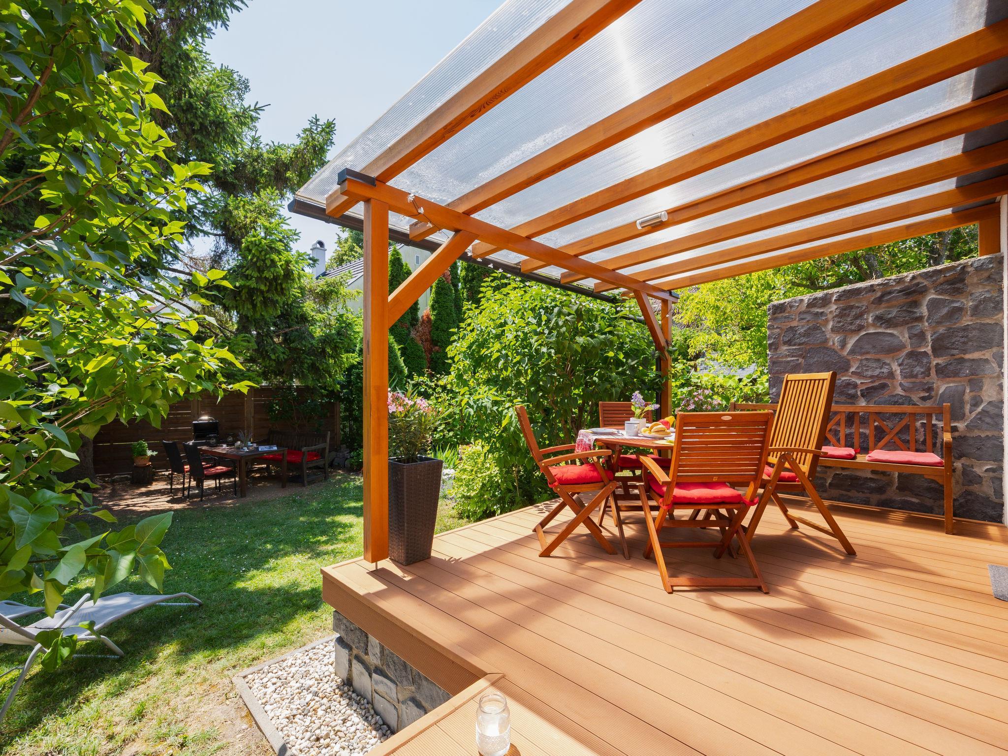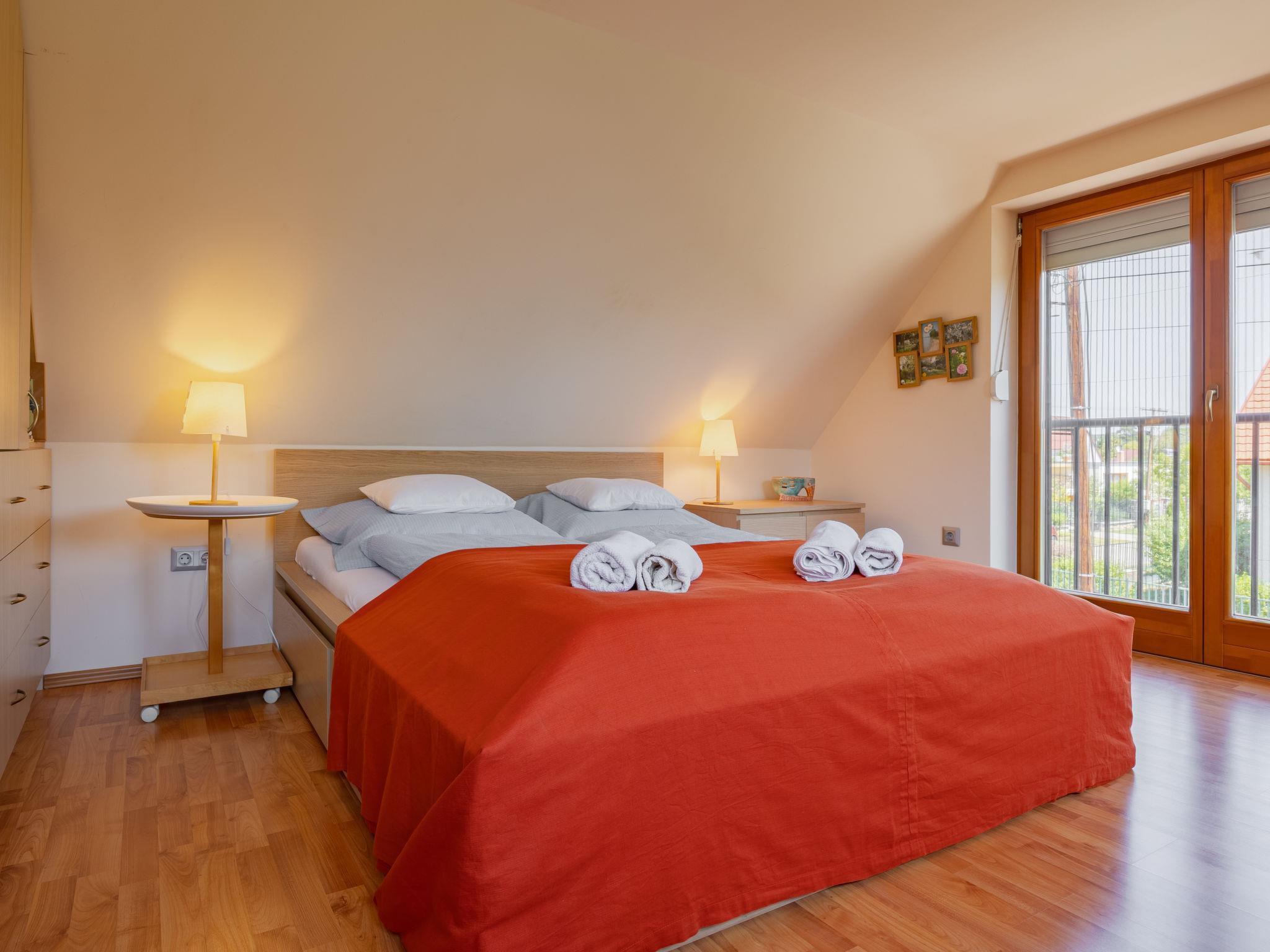 Balatonakali 15 km from Balatonfüred: Cosy, comfortable semi-detached house "Clarissa", 2 storeys. In the resort, 200 m from the lake, 1 km from the beach. Private: property (fenced), garden (not fenced) flowers and trees. (swing). In the house: WiFi, central heating system, air conditioning, washing machine. Parking on the premises. Supermarket 550 m, restaurant 280 m, bakery, café 550 m, bicycle rental 900 m, bus stop "Balatonakali, bejárati út" 400 m, railway station "Balatonakali-Dörgicse" 650 m, thermal baths "Hévíz" 52 km. Marina 400 m, golf course (18 hole) 6 km, tennis 4 km, indoor tennis centre 14 km, riding stable 15 km, sports centre 14 km, cycle lane 50 m, children's playground 350 m. Nearby attractions: Balatonudvari Golf Club 60 km, Tihany templom 13 km, Balatonfüred Annagora Aquapark 14 km, Badacsony 25 km, Folly Arboretum 20 km, Veszprém Zoo 40 km. Please note: baby equipment on request (included). The owner does not accept any youth groups. The keys‘ handover takes place by the agency Interhome in Balatonfüred, 15 km. Railway line closeby 100 m from the property.