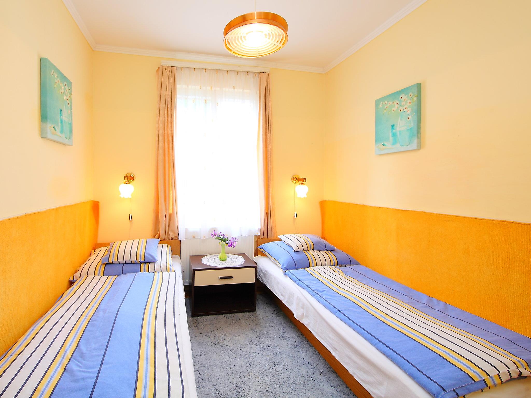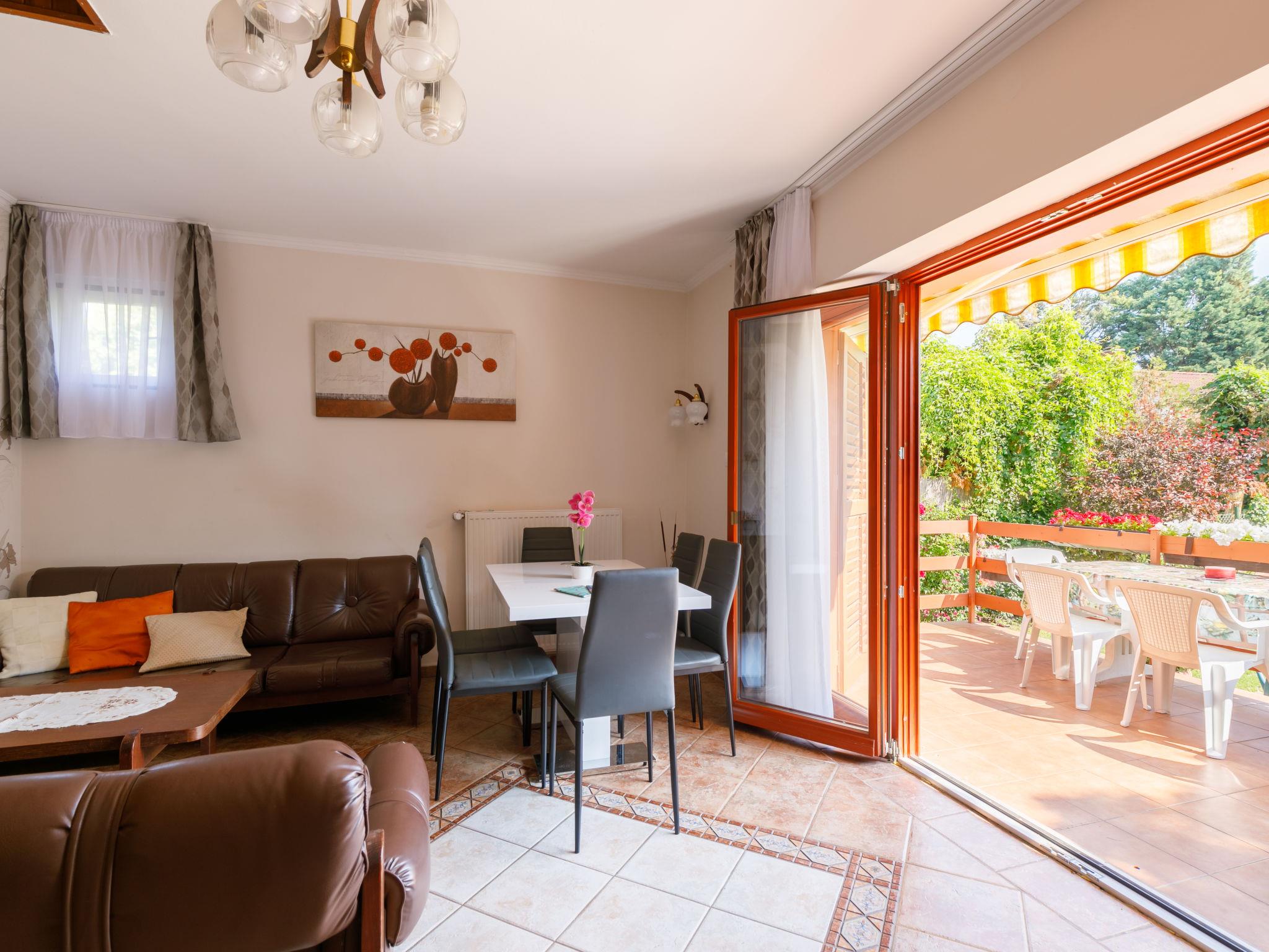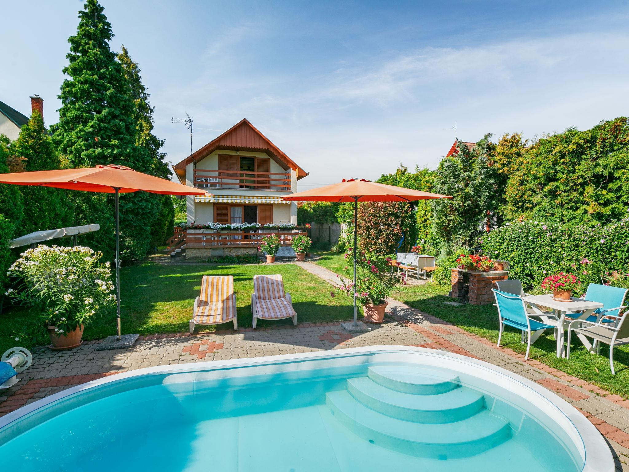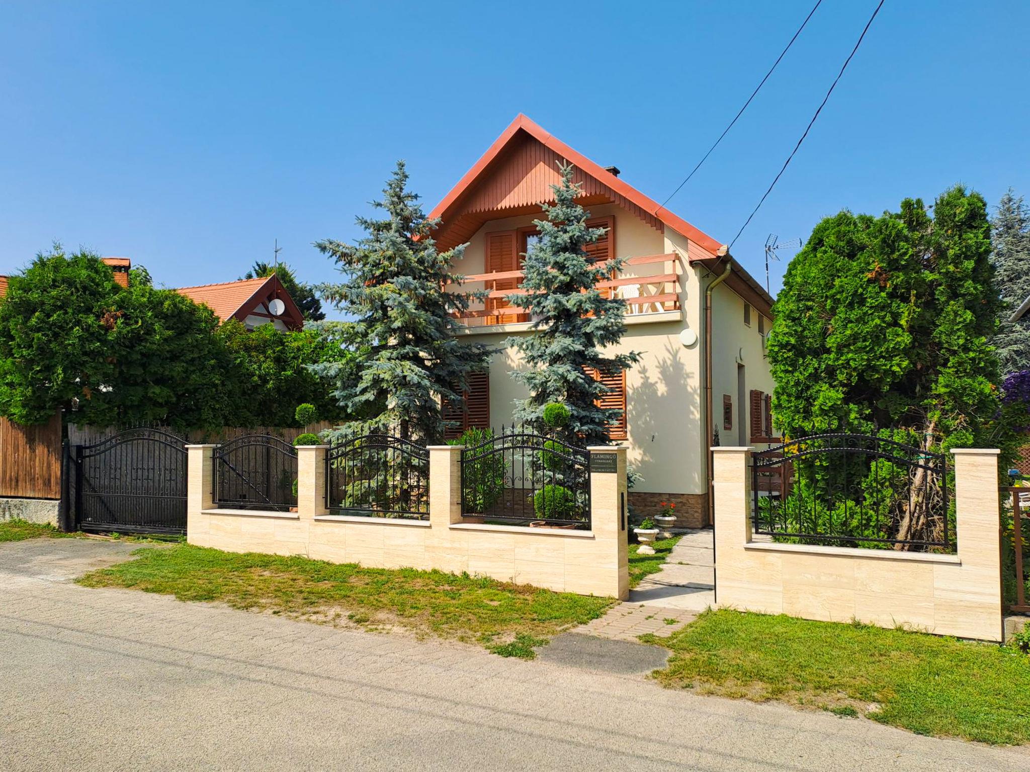 Balatonalmádi 15 km from Balatonfüred: Beautiful house "Flamingo". In the resort, 500 m from the centre, 200 m from the lake, 850 m from the beach. Private: garden (fenced), lawn for sunbathing, swimming pool kidney shaped (13 m2, depth 120 cm, seasonal availability: 01.Jun. - 20.Sep.). Barbecue, fireplace. In the house: WiFi, air conditioning. Available: bicycles (5). Grocery 500 m, supermarket 800 m, restaurant 600 m, bakery 1 km, café 800 m, bicycle rental 1 km, bus stop "Balatonalmádi (Budatava), vasúti" 1 km, railway station "Balatonalmádi" 2 km, grass beach 900 m, indoor swimming pool 4 km, thermal baths "Hévíz" 81 km. Sailing school 1 km, tennis 1 km, riding stable 3 km, cycle lane 100 m, children's playground 700 m. Nearby attractions: Balatonfüred 16 km, Tihany 21 km, Veszprém Zoo 16 km, BalatonBob Theme Park 9 km, Annagora Aquapark 16 km, Balaton Golf Club 23 km. Please note: the keys‘ handover takes place by the agency Interhome in Balatonfüred, 16 km. Railway line closeby 60 m from the property.