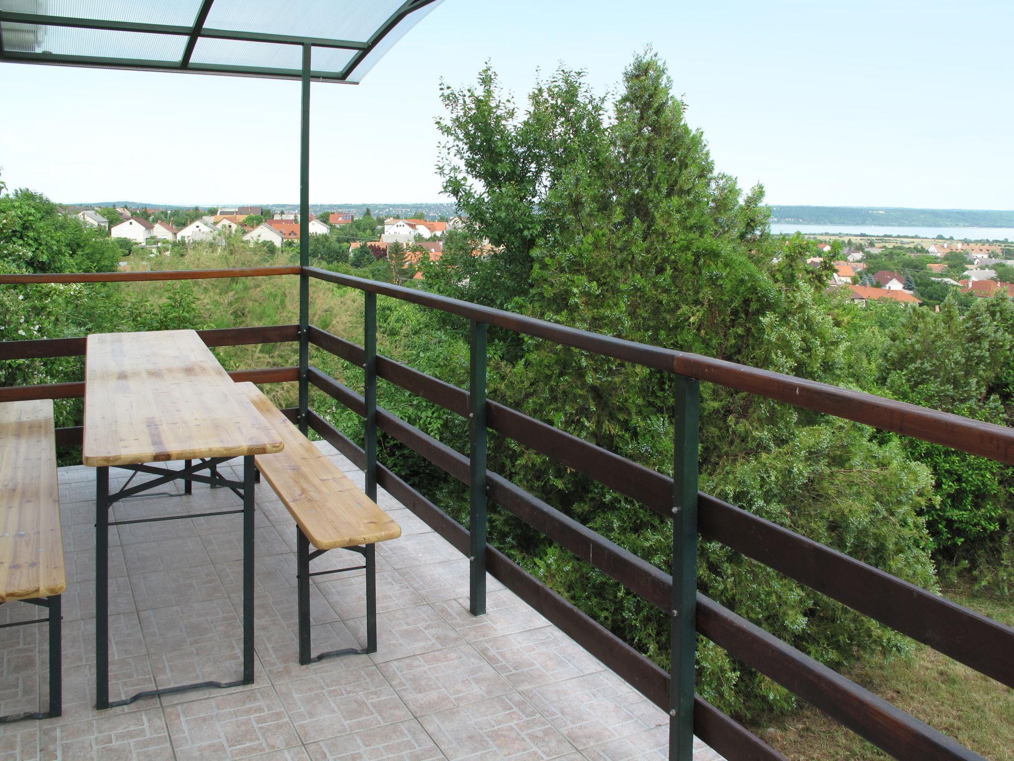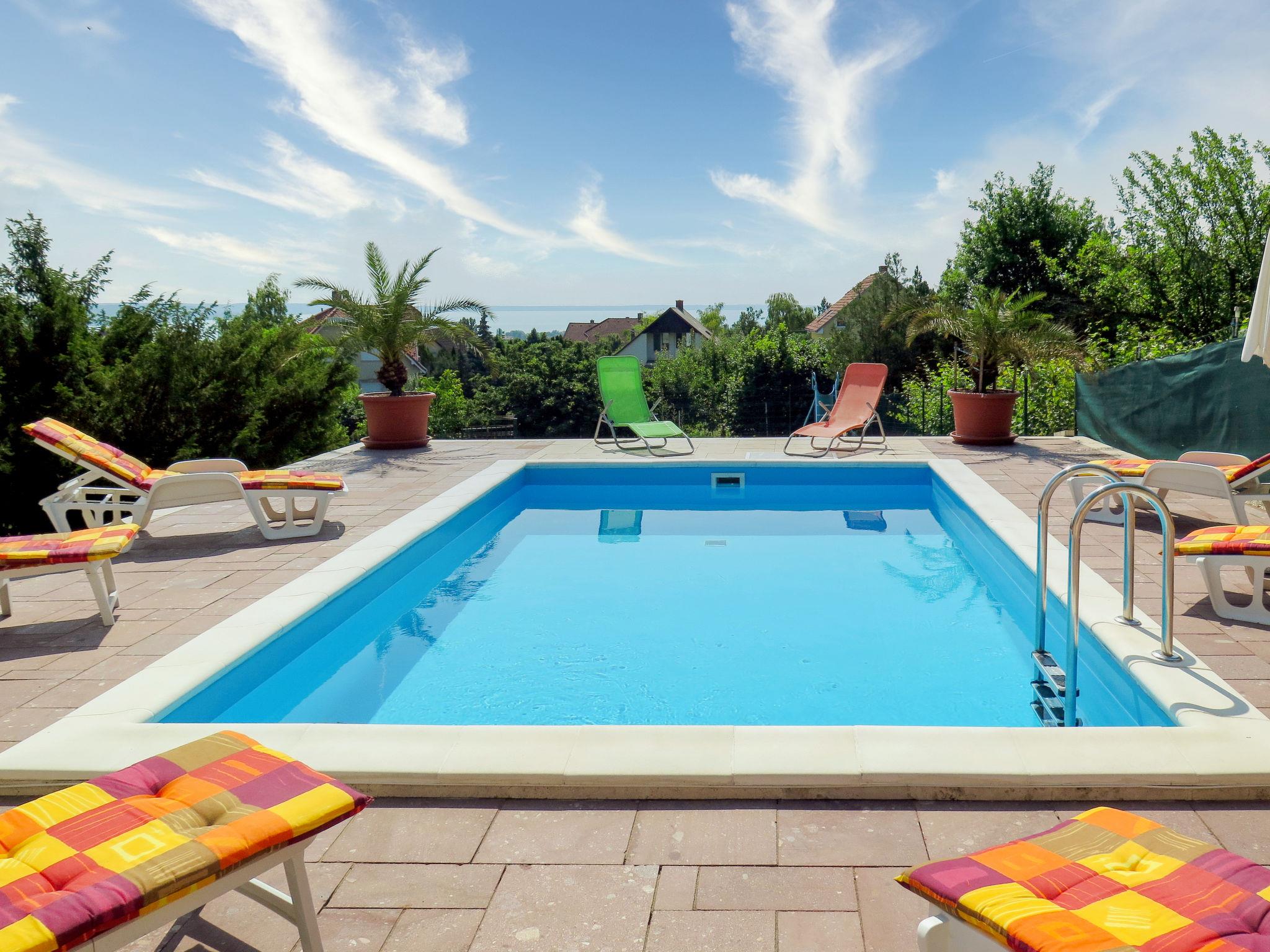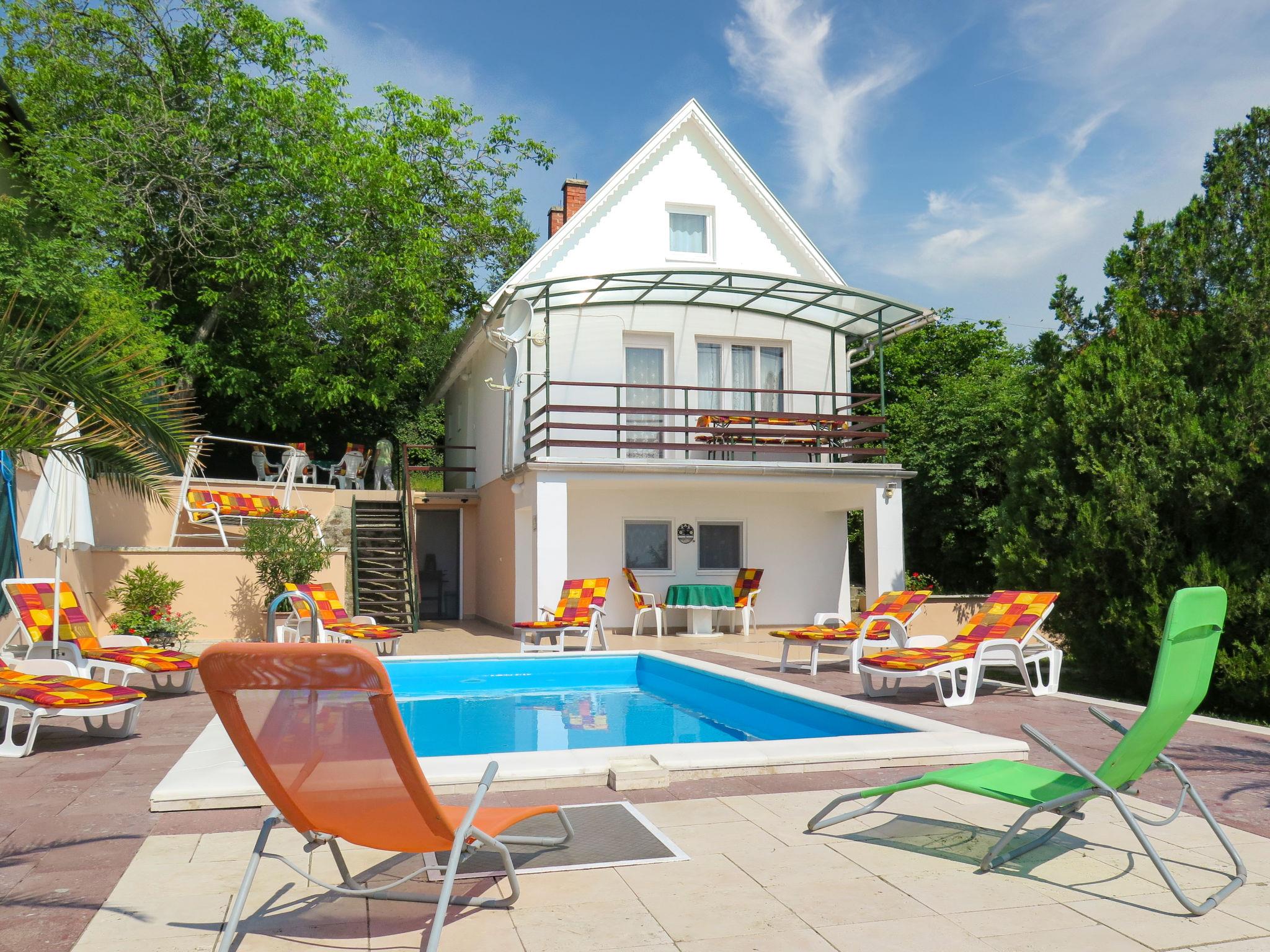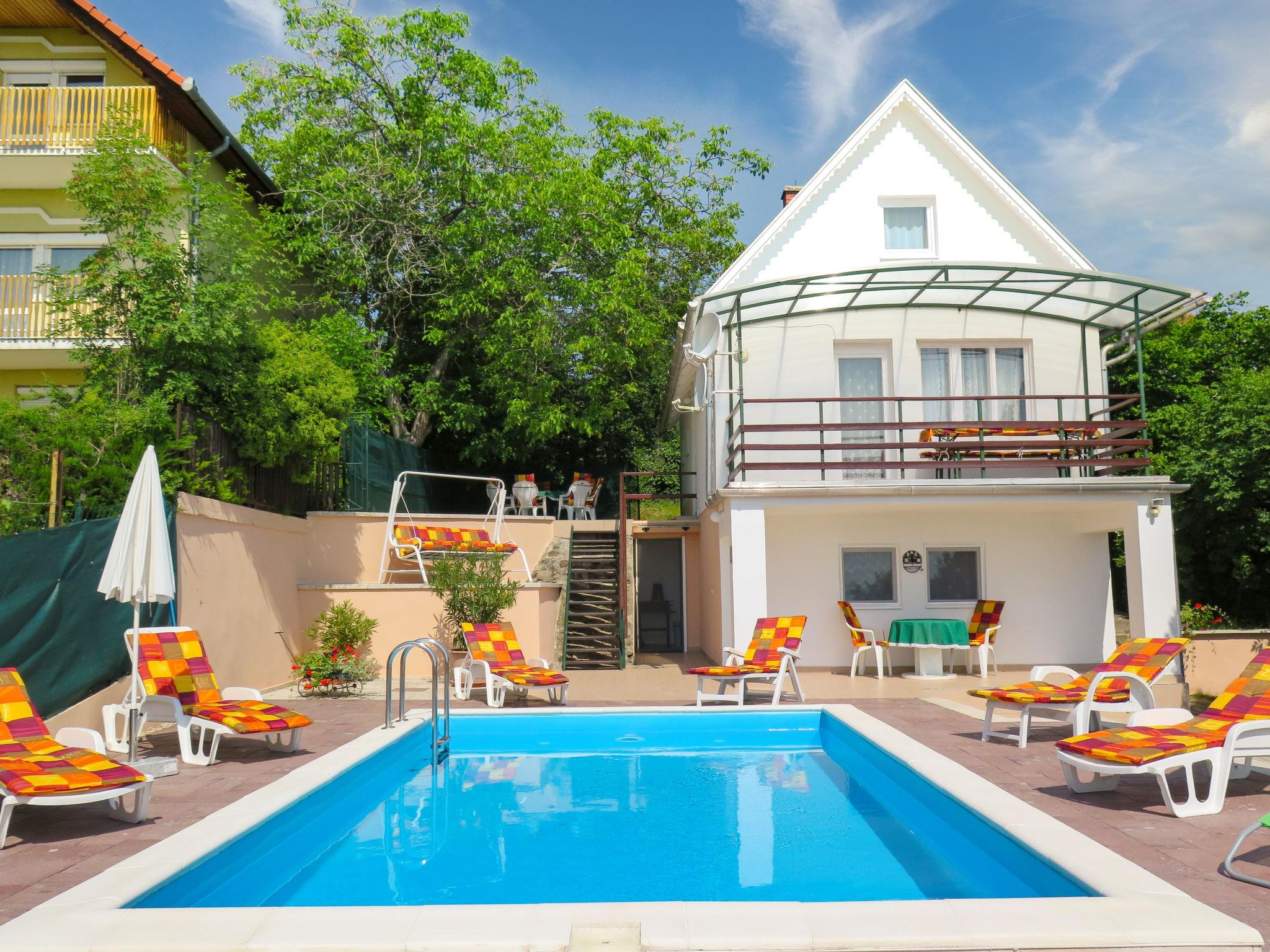 Balatonalmádi 16 km from Balatonfüred: Beautiful single-family house "Annemarie". 2 km from the centre of Balatonalmadi, on the outskirts, 7 km from the centre of Balatonfüzfö, 17 km from the centre of Balatonfüred, on a slope, in the residential district, 2.4 km from the lake, 2.8 km from the beach. Private: property 800 m2 (fenced) with trees, meadow, swimming pool heated (6 x 4 m, depth 120 cm, seasonal availability: 15.May. - 30.Sep.). Children's playground (slide). In the house: table football. 200 m long bumpy motor access. Stepped path to the house. Parking (for 3 cars) on the premises. Grocery 1 km, supermarket 2 km, grass beach 2.4 km, thermal baths "Pápai Thermal Bath" 62 km. Tennis 2 km, riding stable 2 km, cycle lane 2 km, children's playground 2 km. Nearby attractions: BalatoniBob Theme Park 5 km, Veszprém Zoo 15 km, Balatonfüred Annagora Aquapark 18 km, Tihany 24 km, Balaton Theme Park Nosztori 18 km, Koloska Valley 18 km.