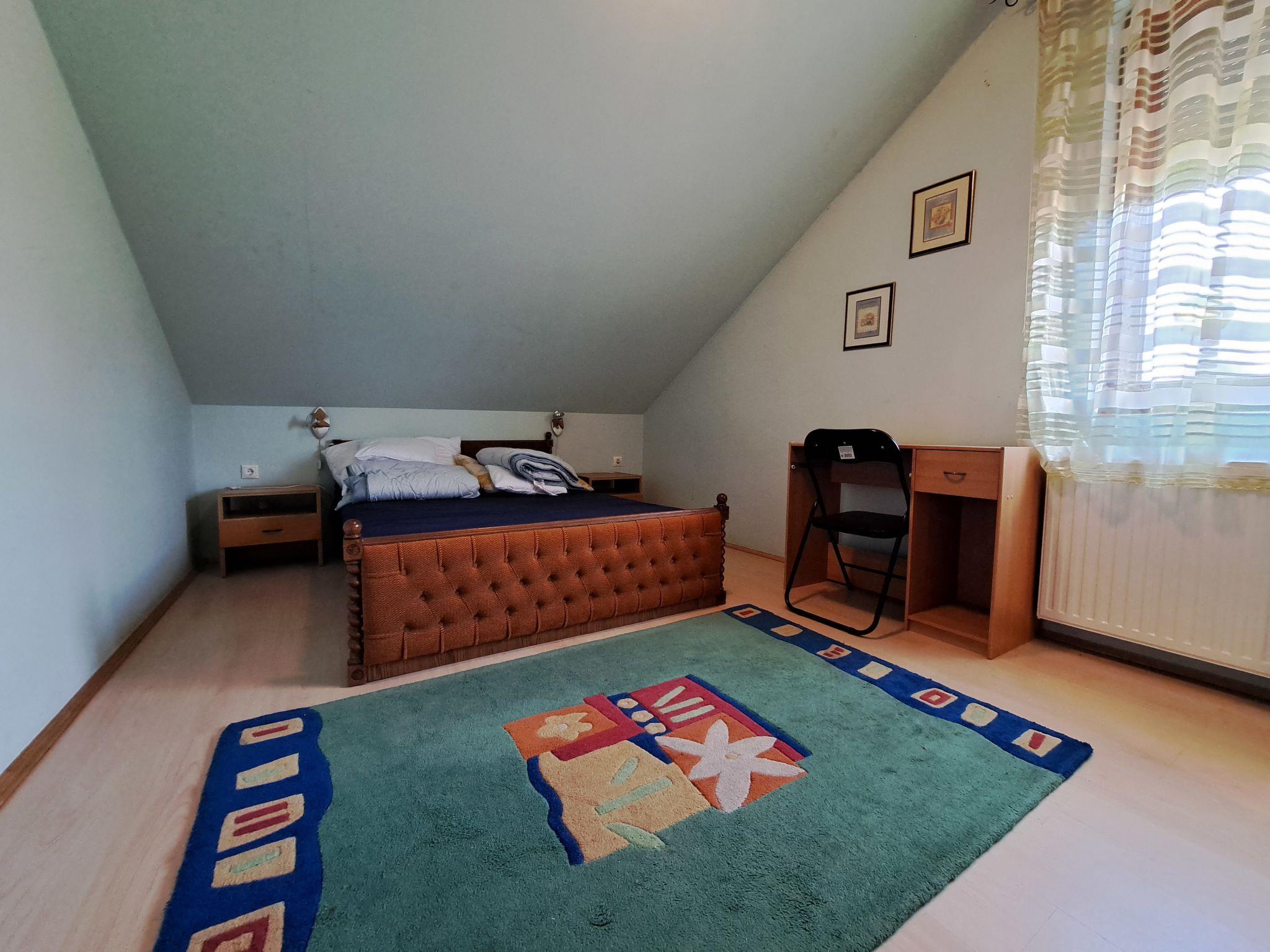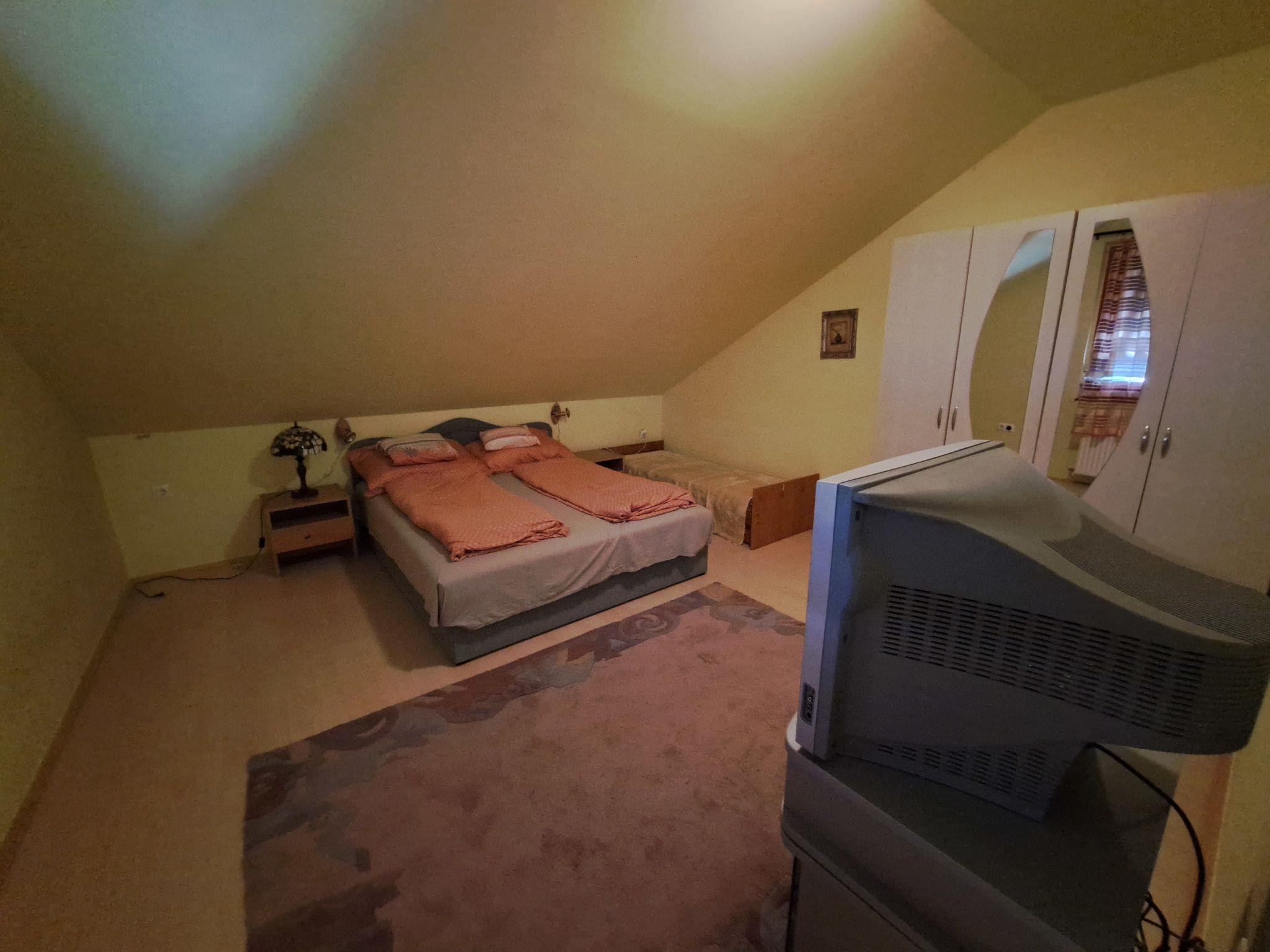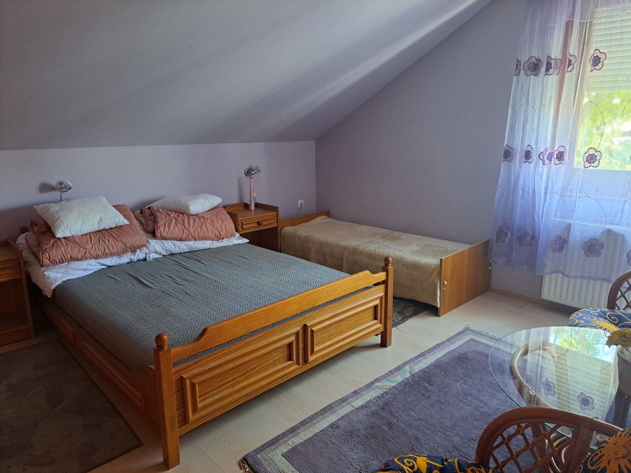 "Boros", 4-room house 90 m2 on 2 levels. Practical furnishings: living room with dining table, satellite TV and hi-fi system. Exit to the terrace. Open kitchen (oven, dishwasher, 4 ceramic glass hob hotplates, toaster, kettle, microwave, freezer, electric coffee machine). Shower/WC. No heating option. Top floor: 1 room with sloping ceilings with 1 french bed. 1 double bedroom with sloping ceilings. 1 room with sloping ceilings with 1 bed and 1 french bed (160 cm, length 200 cm). Bath/WC. Air-conditioning. No heating option. Parquet floors. Terrace partly roofed. Terrace furniture, deck chairs (2). Facilities: Internet (WiFi, free). Please note: non-smoking house. MA20009320