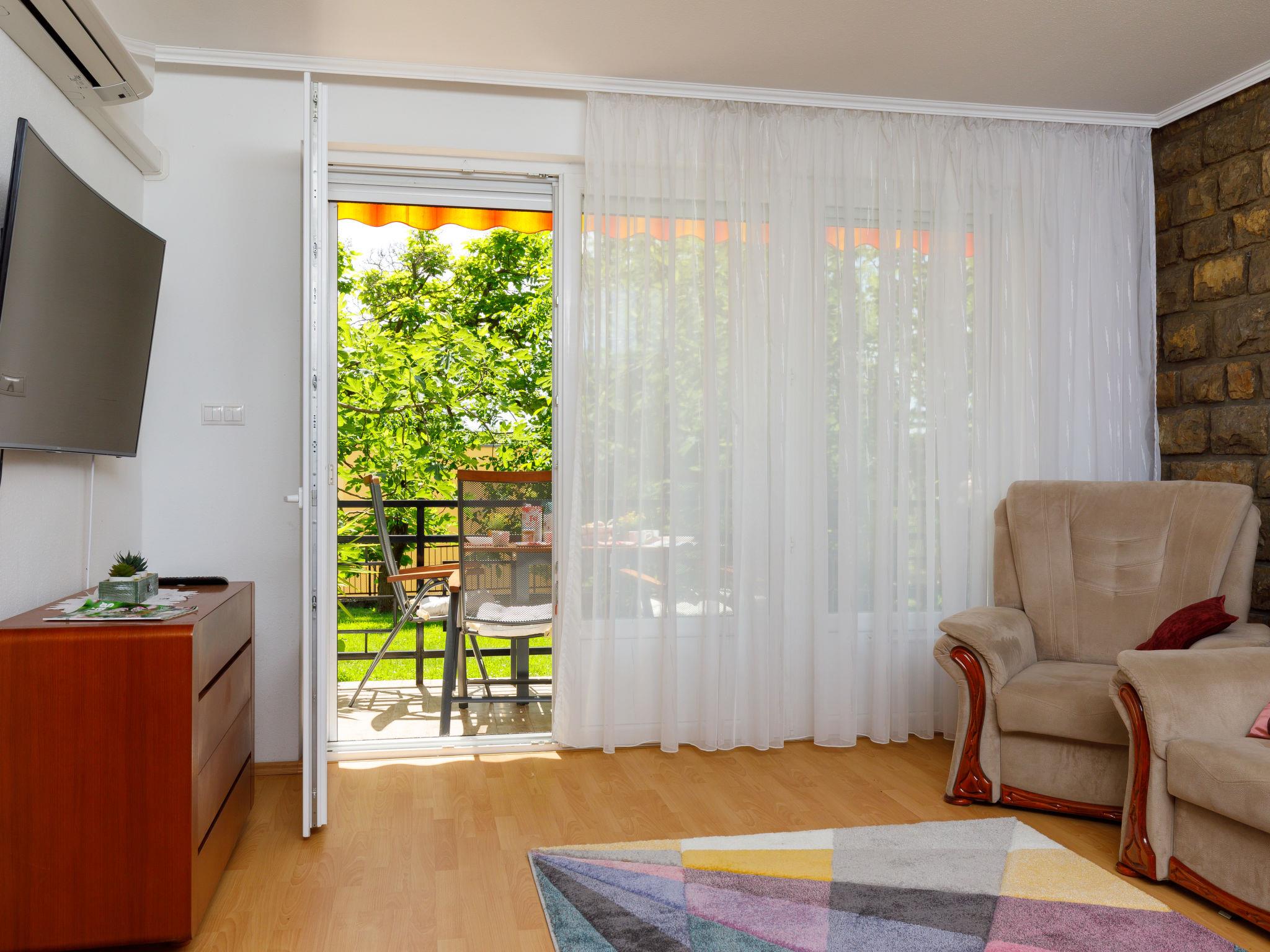 Balatonfüred: Large apartment block "Lily". In the centre of Balatonfüred, in a central position, 250 m from the lake, 300 m from the beach. In the house: WiFi, air conditioning. Parking space n 16. Grocery 400 m, supermarket 750 km, restaurant 600 m, bakery 900 m, café, pedestrian zone 300 m, bicycle rental 1000 km, bus stop "Balatonfüred, Kiserdo" 550 m, railway station "Balatonfüred, Arács" 900 m, grass beach 300 m, thermal baths "Hévíz" 69 km. Marina 1 km, golf course (18 hole) 9 km, sailing school 1 km, tennis 230 m, indoor tennis centre 4 km, sports centre 4 km, cycle lane 200 m, children's playground 450 m. Nearby attractions: Wine Festival in August 200 m, Lóczy Cave Visitor Center 2.7 km, Vaszary Gallery 1 km, Annagora Aquapark 2 km, Bodorka - Balaton Aquarium 700 m, Tihany 8 km. The keys‘ handover takes place by the agency Interhome in Balatonfüred, 1 km.