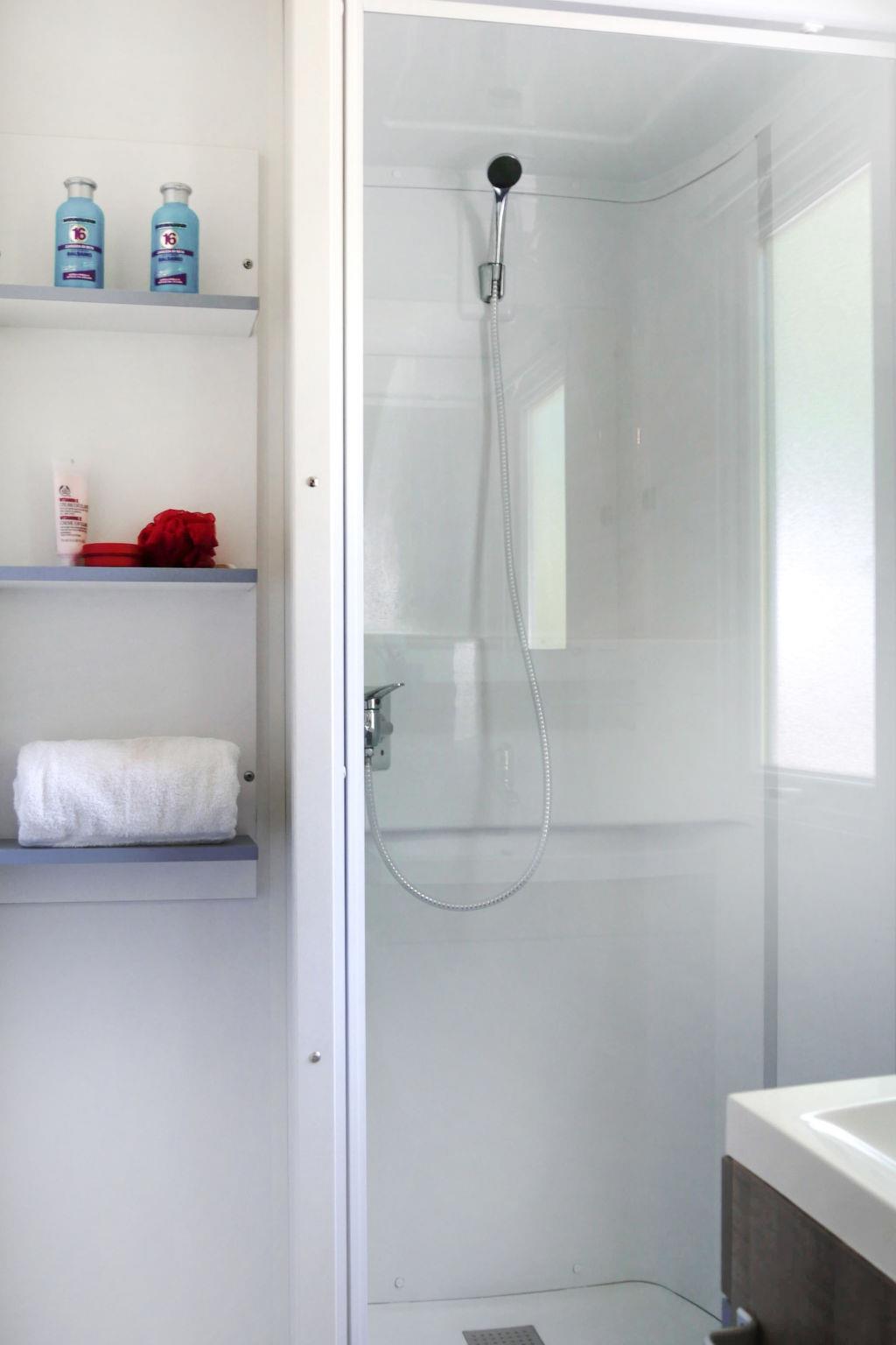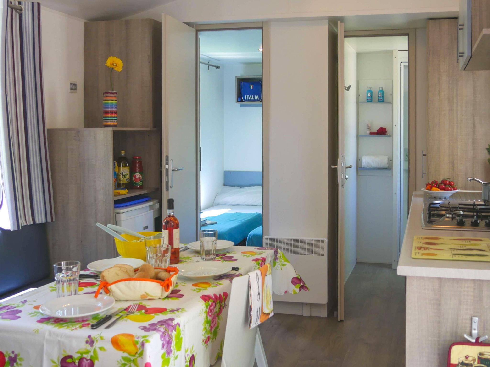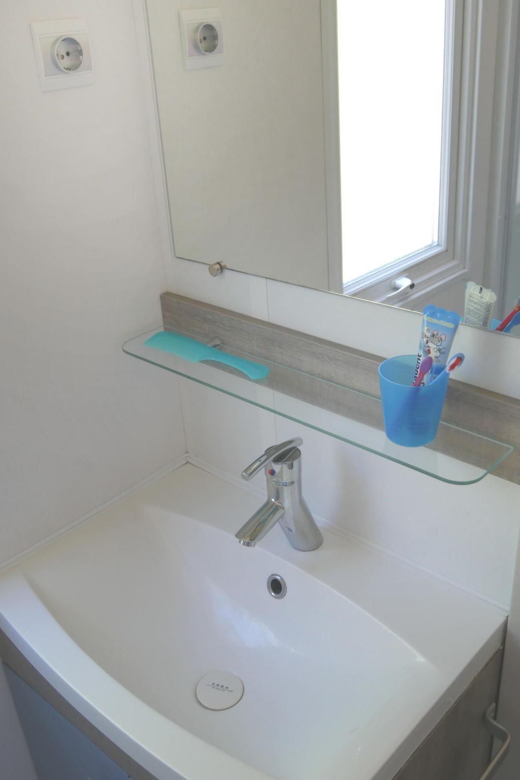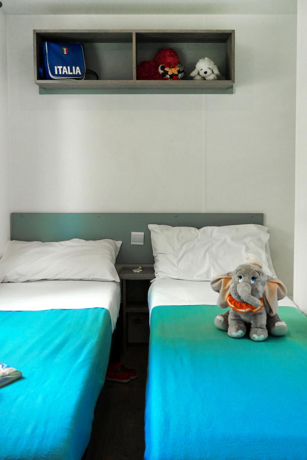 "Happy Comfort", 3-room mobile home 25 m2. Object suitable for 4 adults + 1 child. Practical furnishings: living/sleeping room with 1 sleeping facility, dining table, electric heating and air conditioning. 1 room with 1 french bed (140 cm, length 190 cm). 1 room with 2 beds (70 cm, length 190 cm). Open kitchen (4 hot plates). Shower/WC. Air-conditioning (extra). Terrace partly roofed. Terrace furniture, electric barbecue (portable), deck chairs (2). Facilities: mosquito net. Parking (1 car). Please note: non-smokers only. KE19004810