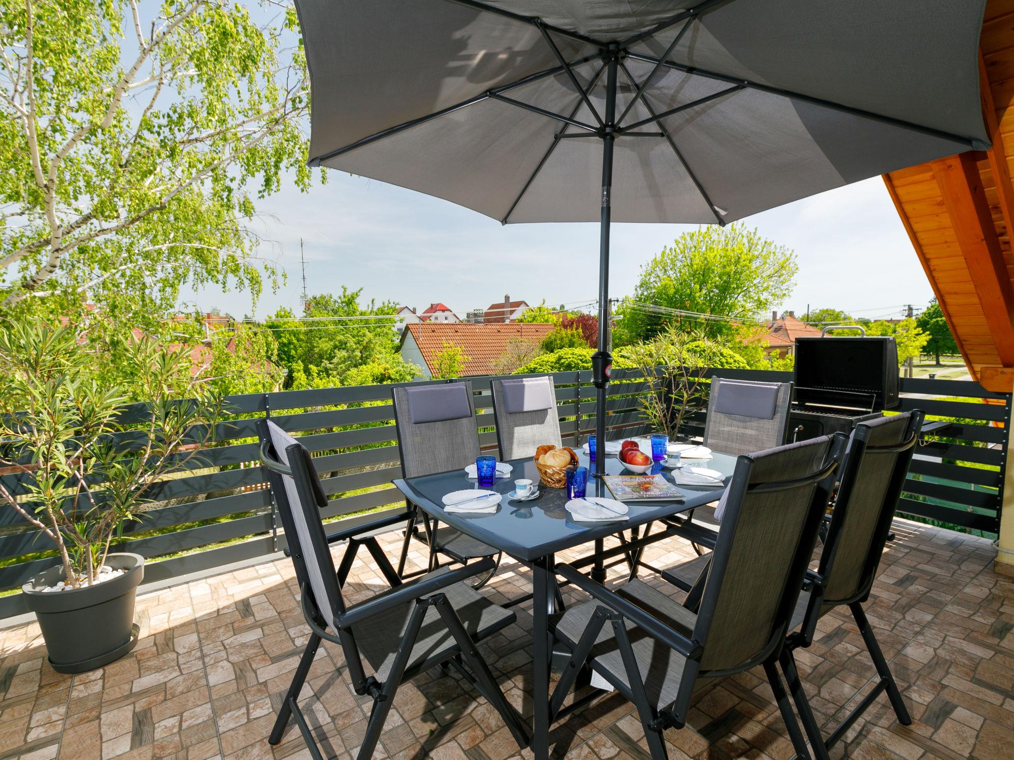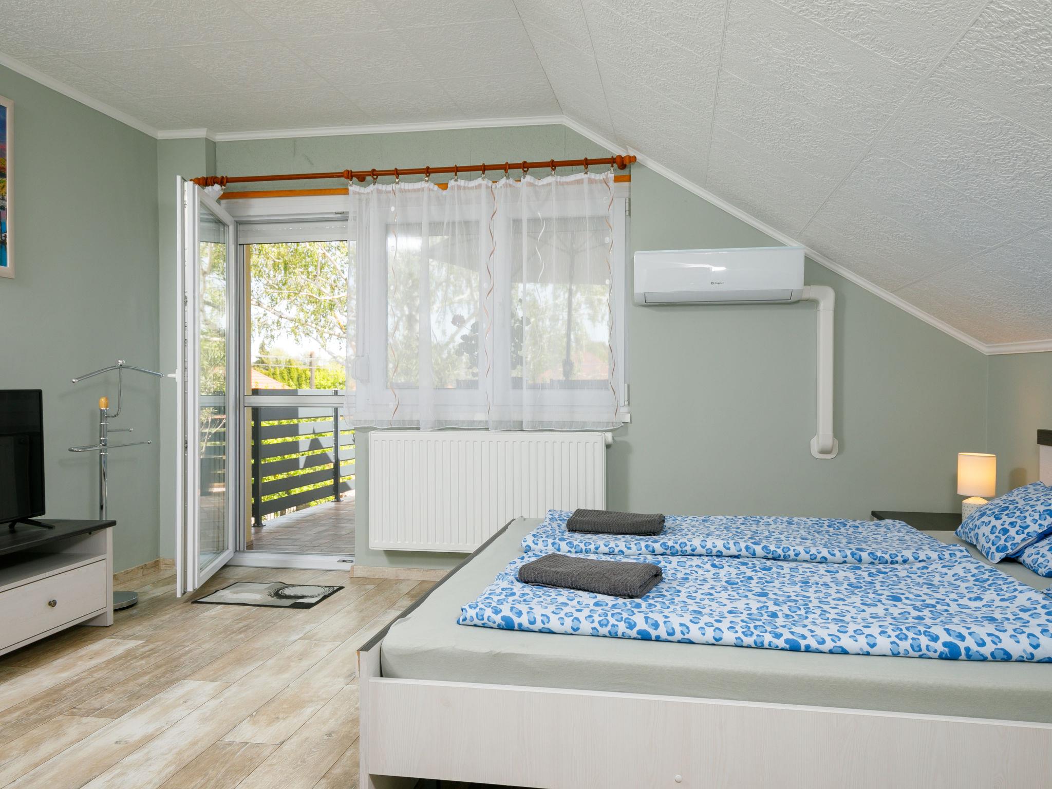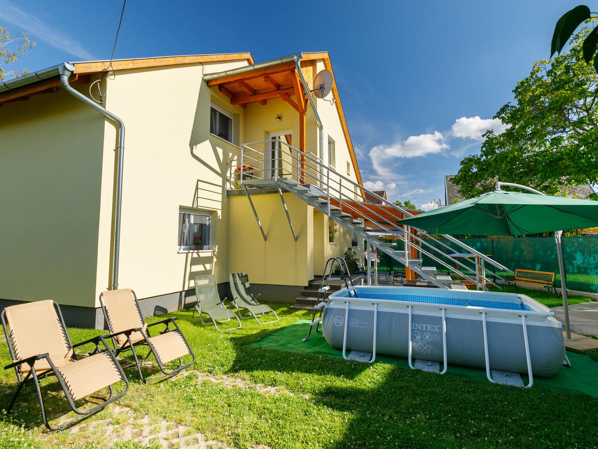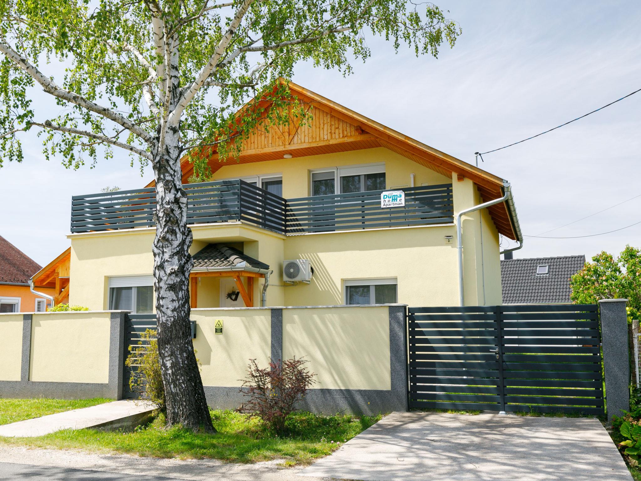 Balatonkeresztúr 20 km from Keszthely: Modern 2-family house, 2 storeys in 2022. 570 m from the lake, 700 m from the beach. Private: garden (fenced), swimming pool (above ground) (3 x 2 m, seasonal availability: 01.Jun. - 15.Sep.). Garden furniture. In the house: WiFi, central heating system, air conditioning, washing machine. Parking (for 2 cars) on the premises. Grocery 260 m, supermarket 9 km, restaurant 800 m, bakery 500 m, café 450 m, bicycle rental 8 km, thermal baths "Hévíz" 25 km. Sailing school 1 km, tennis 900 m, cycle lane 50 m, children's playground 450 m. Nearby attractions: Bella Zoo Siófok 73 km, Szántód Ferry 52 km, Adventure Park Zamárdi 60 km, Festetics Castle 20 km, Hévíz Thermal Bath 25 km, Kis-Balaton Visitor Centre 14 km.