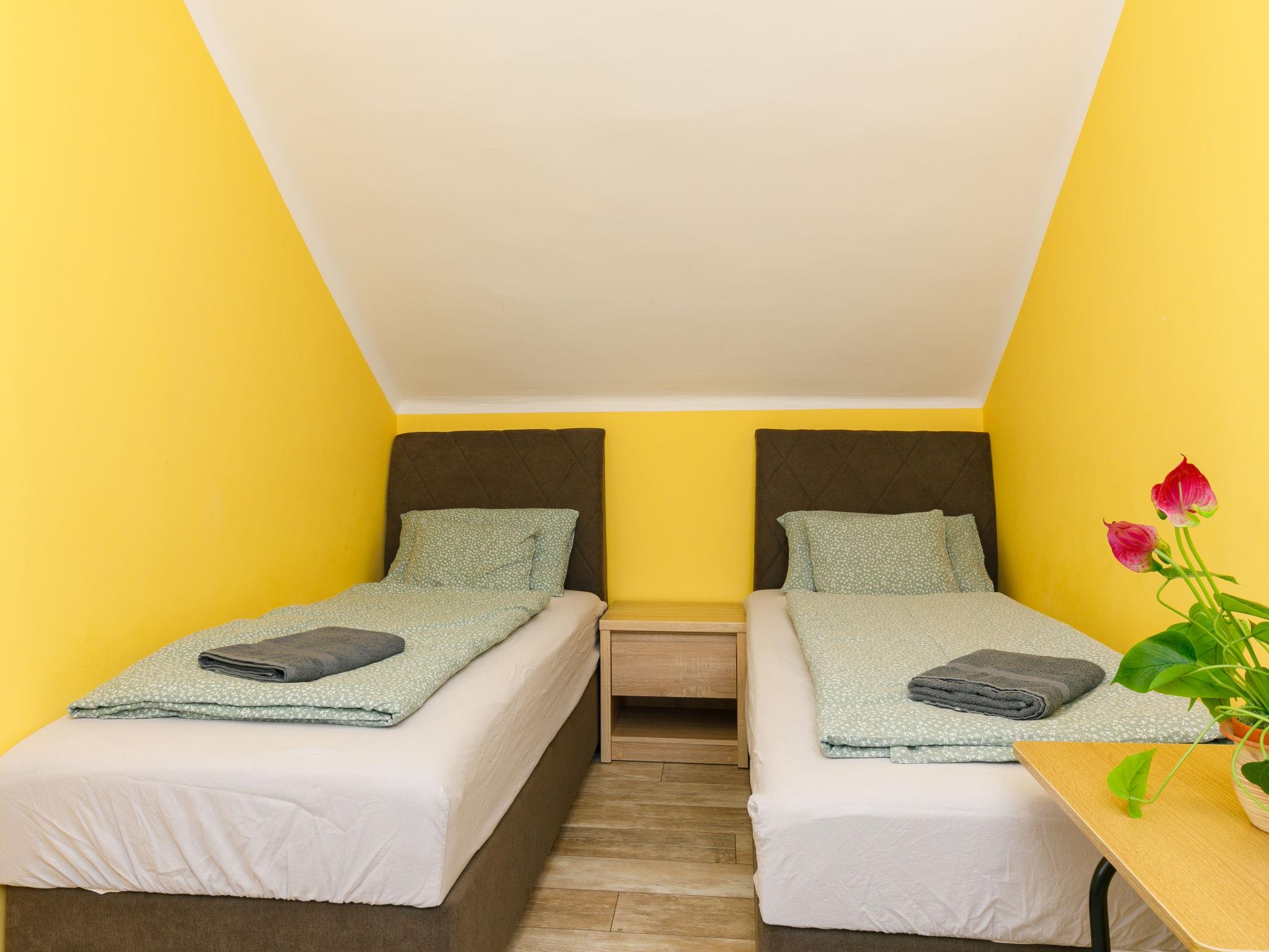 "Duma", 3-room apartment. Very comfortable furnishings: dining room with dining table. 2 double bedrooms, each room with 1 french bed (160 cm, length 200 cm), cable TV, flat screen and air conditioning. Exit to the balcony. 1 room with 2 beds (90 cm, length 200 cm). Open kitchen (dishwasher, 2 ceramic glass hob hotplates, toaster, kettle, microwave, electric coffee machine). 2 showers, 2 sep. WC's. Heating (extra). Balcony furniture, barbecue, deck chairs (2). Facilities: mosquito net. Please note: private entrance, smoke alarm. MA20018804