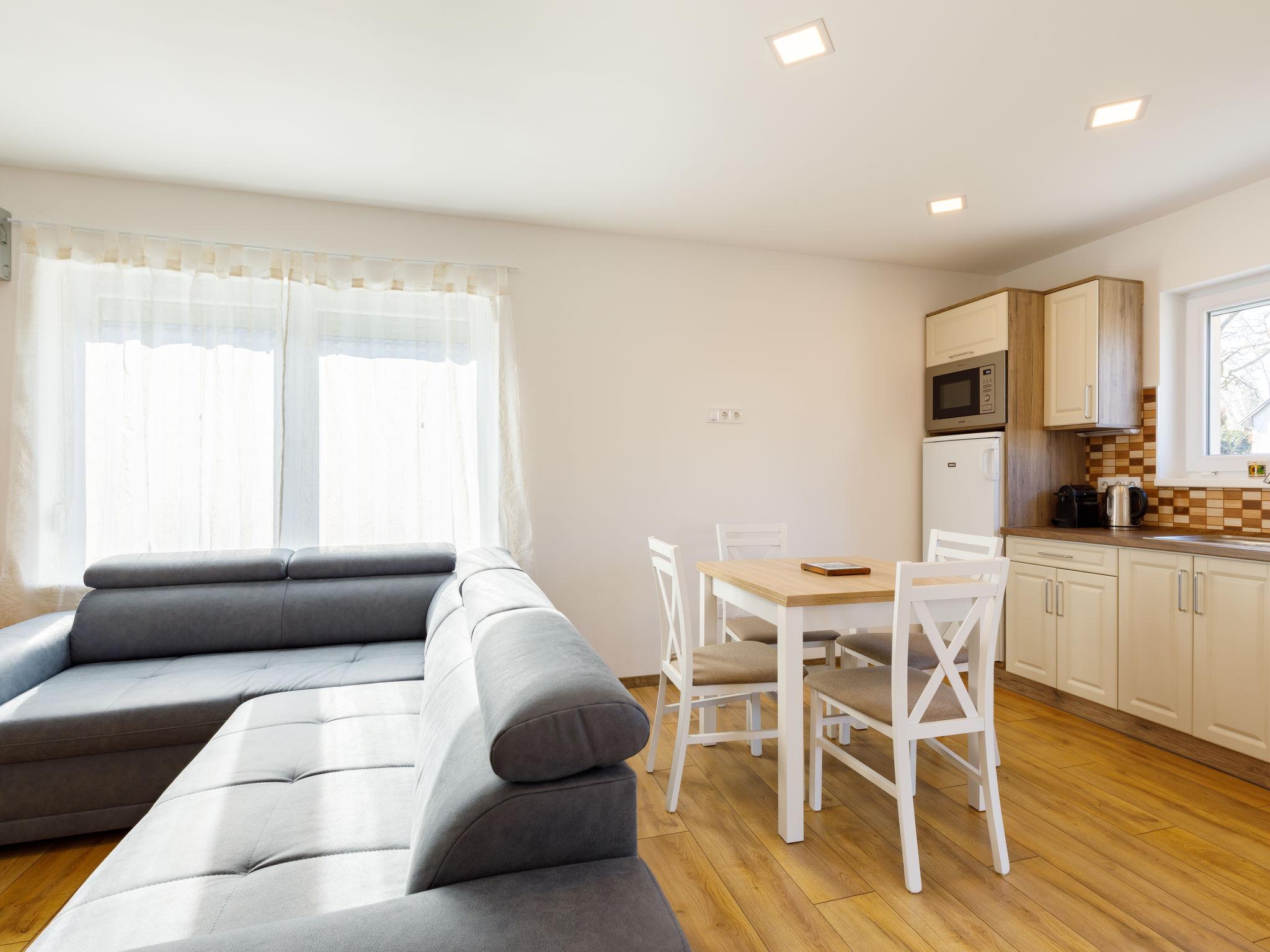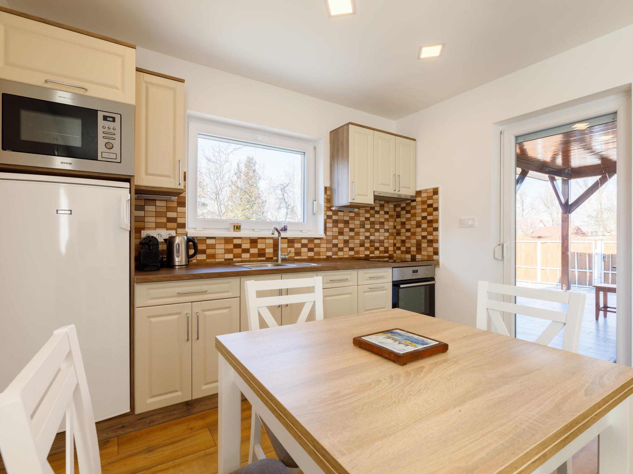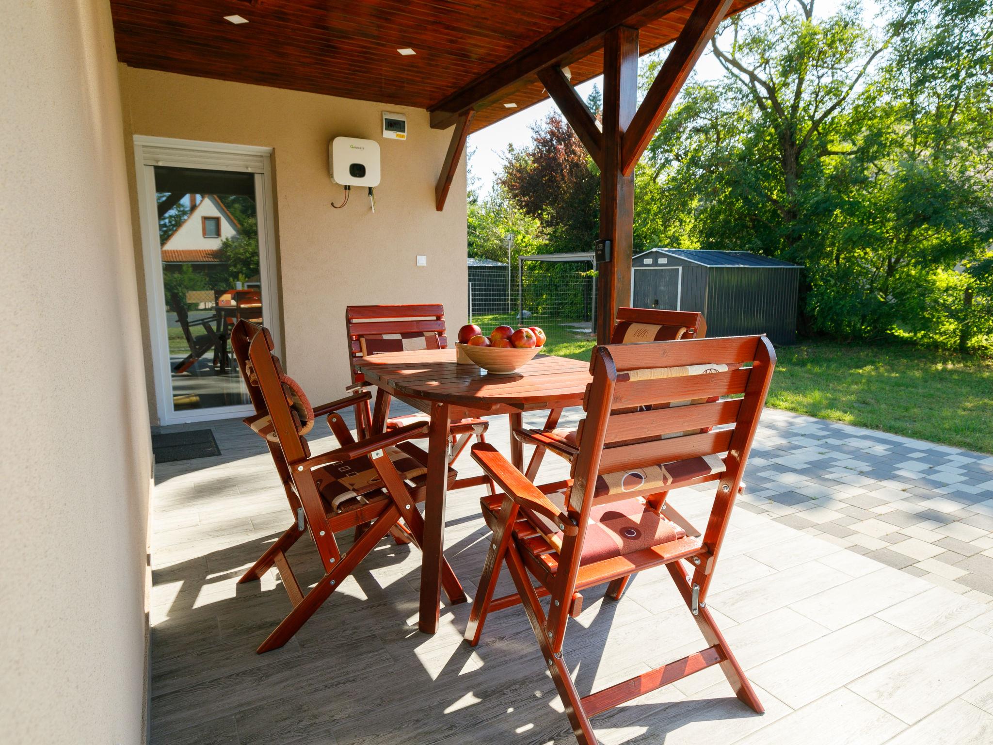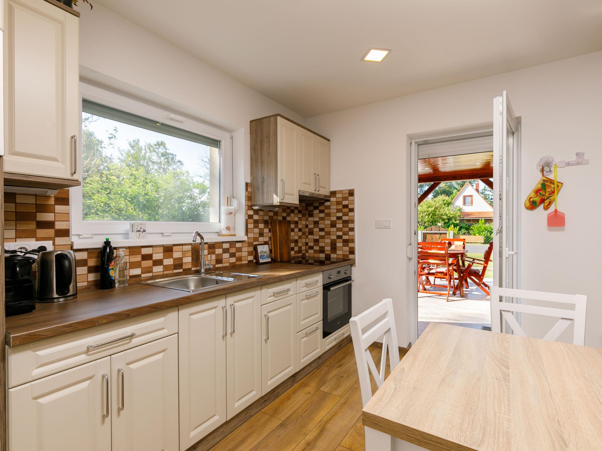Balatonkeresztúr 22 km from Keszthely: Beautiful, comfortable house "Honey", built in 2022. In the resort, 600 m from the lake, 400 m from the beach. Private: property (fenced), lawn for sunbathing. Terrace. In the house: WiFi, air conditioning, washing machine, tumble dryer. Parking (for 2 cars) at the house. Grocery 150 m, supermarket 5 km, restaurant 500 m, bar 900 m, bakery 900 m, bicycle rental 5 km, railway station 3 km, grass beach 300 m, thermal baths "Csiszta" 17 km. Surf school 6 km, sailing school 6 km, tennis 3 km, riding stable 150 m, cycle lane 200 m, children's playground 800 m, fishing possibilities 300 m. Nearby attractions: Hévíz Thermal Bath 20 km, Festetics Palace 20 km, Rubin Winery 5 km, Airport 2 km, Somoshegyi Viewpoint 7 km, Siófok - Ferris Wheels 62 km.