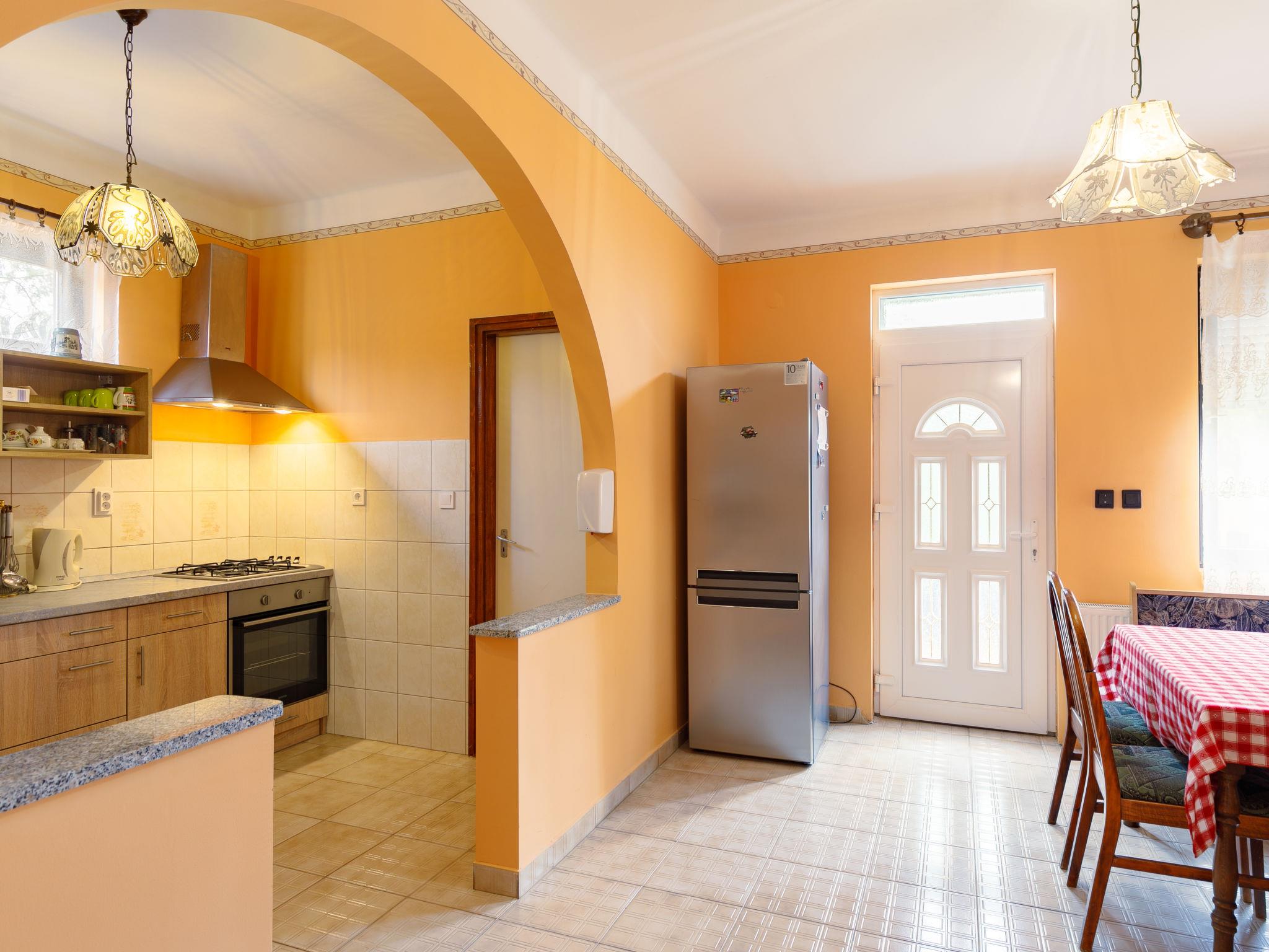 Balatonlelle 40 km from Siófok: Cosy single-family house "May", renovated in 2021. In the resort, 1.6 km from the lake, 1.7 km from the beach. Private: property 600 m2 (fenced), large garden with lawn and trees. Terrace (20 m2), garden furniture, barbecue, fireplace. In the house: WiFi, air conditioning. Supermarket 1.5 km, restaurant 1.5 km, bakery 1.3 km, bicycle rental 1.5 km, bus stop 1.5 km, railway station 1.5 km, grass beach 2.4 km, thermal baths "Igal" 37 km. Marina 2 km, surf school 2 km, tennis 2 km, riding stable 1.4 km, cycle lane 1.5 km, children's playground 1 km. Nearby attractions: Balatonlelle Theme Park 3 km, Balatonlelle Giant Wheel 3 km, Rádpuszta gastronomic experience farm 9 km, Kereki Dino Park 27 km, Balatonlelle wine week 2 km, Konyári winery 4 km.
