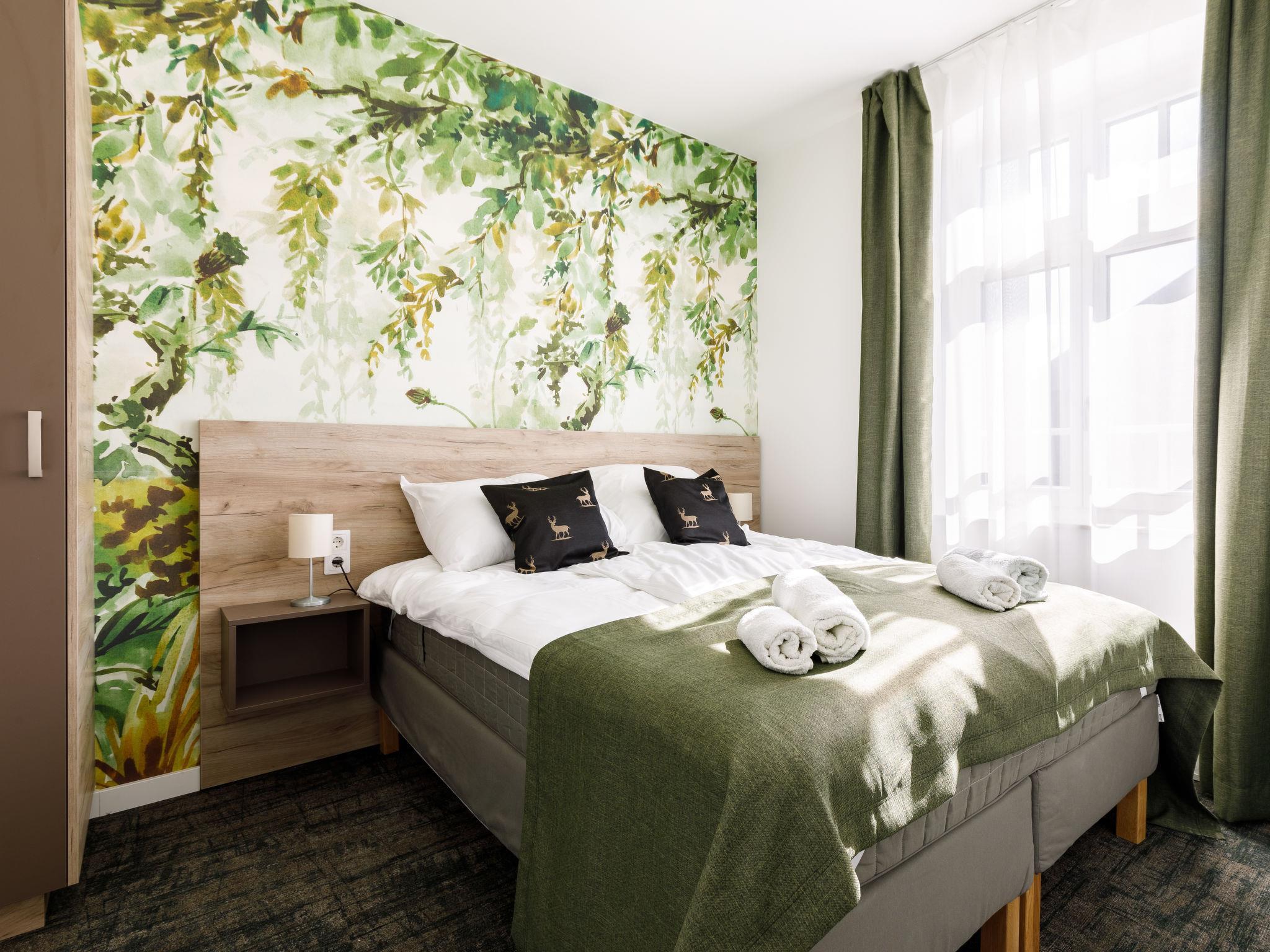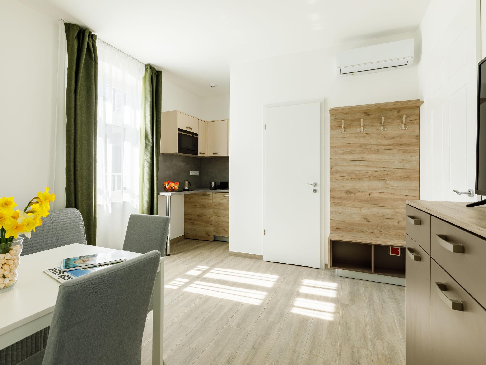 "Park 1", 2-room apartment on the ground floor. Beautiful and modern furnishings: open living/dining room with 1 pull-out bed and cable TV (flat screen). 1 double bedroom with 1 french bed (160 cm, length 200 cm). Small, open kitchen (2 ceramic glass hob hotplates, microwave, electric coffee machine). Shower/WC. Heating, floor heating. Solar power. Facilities: children's high chair, baby cot (extra), hair dryer. Internet (WiFi). Please note: apartment courtyard side. Type of coffee machine: Nespresso.