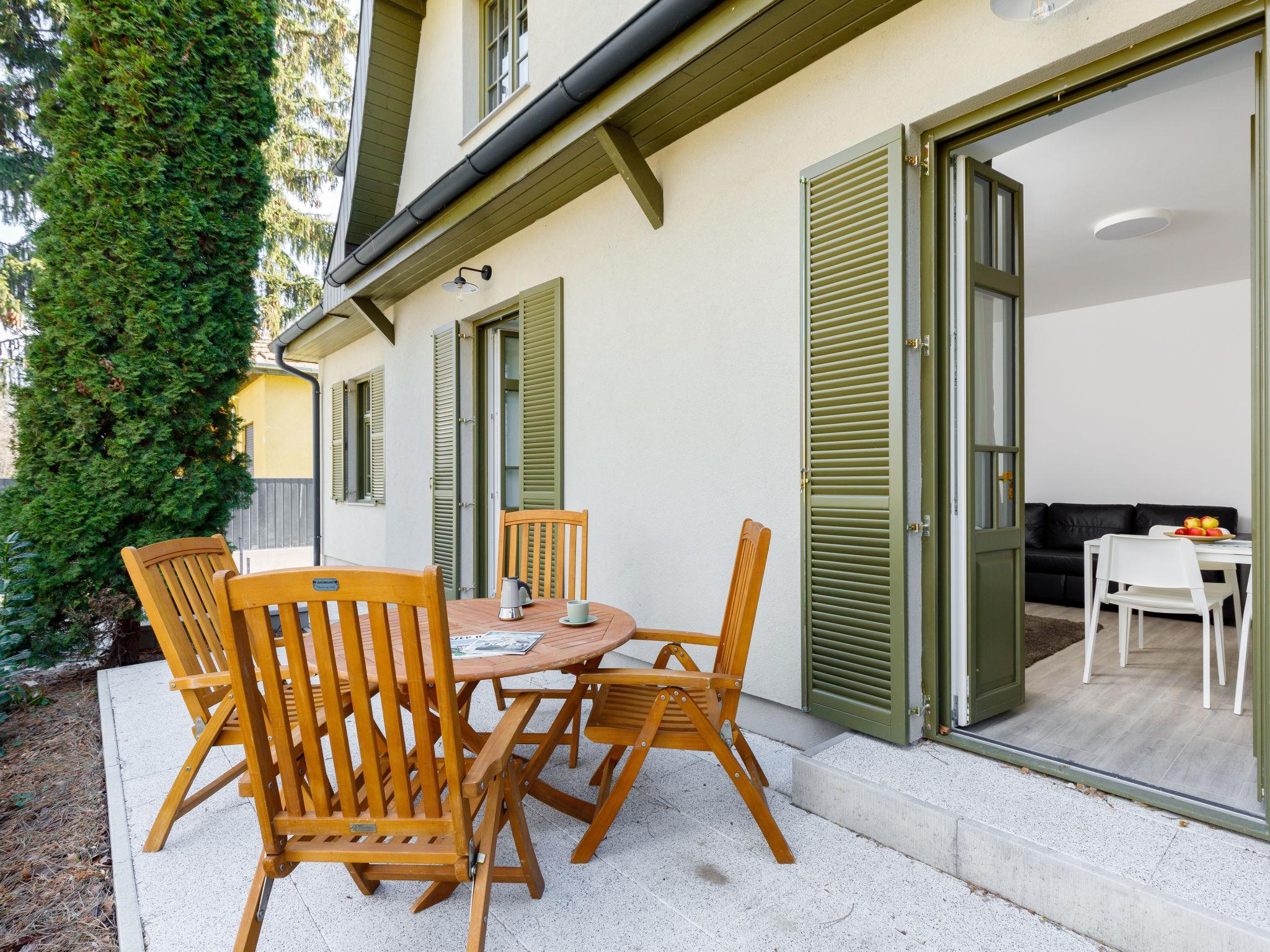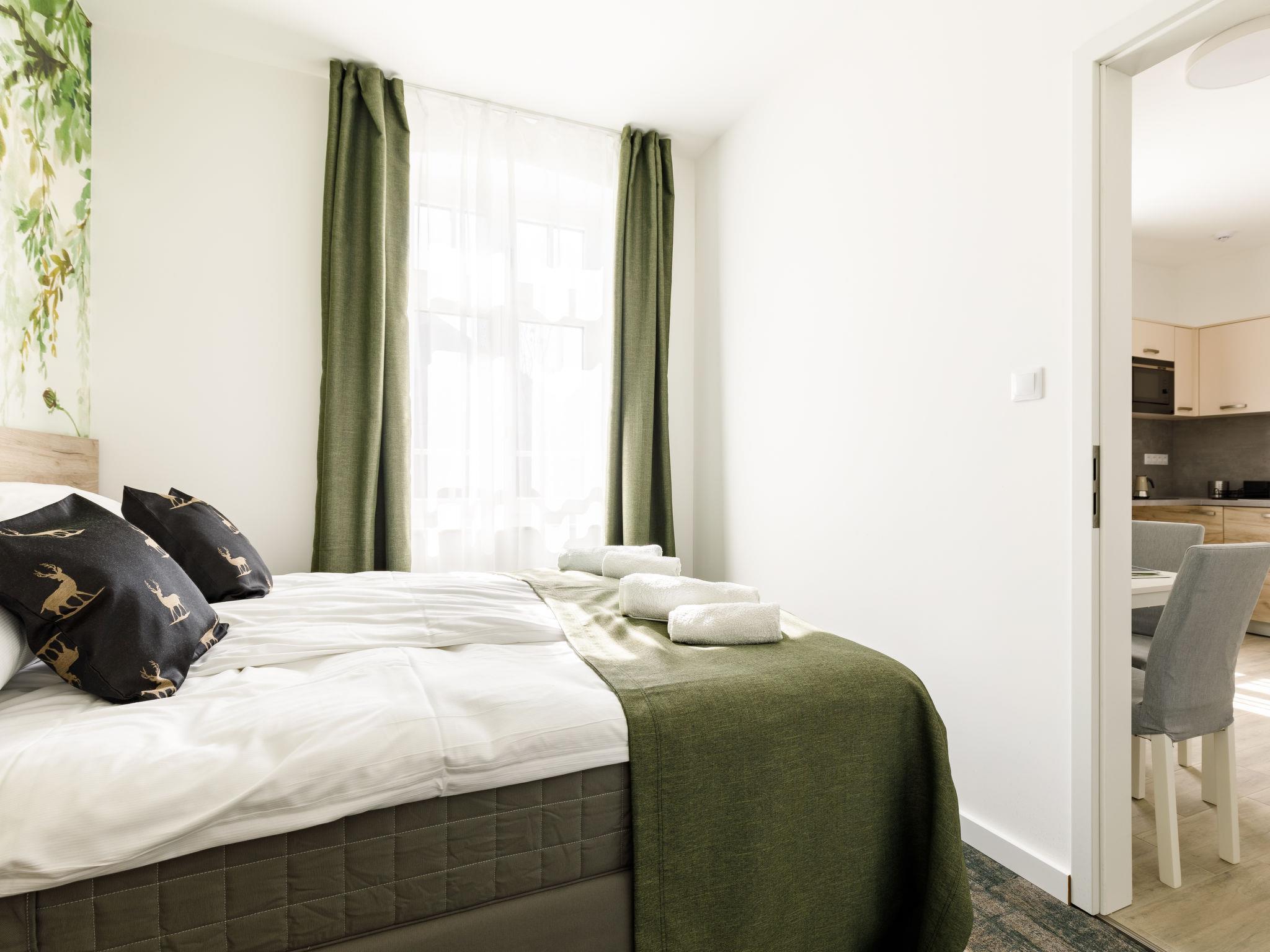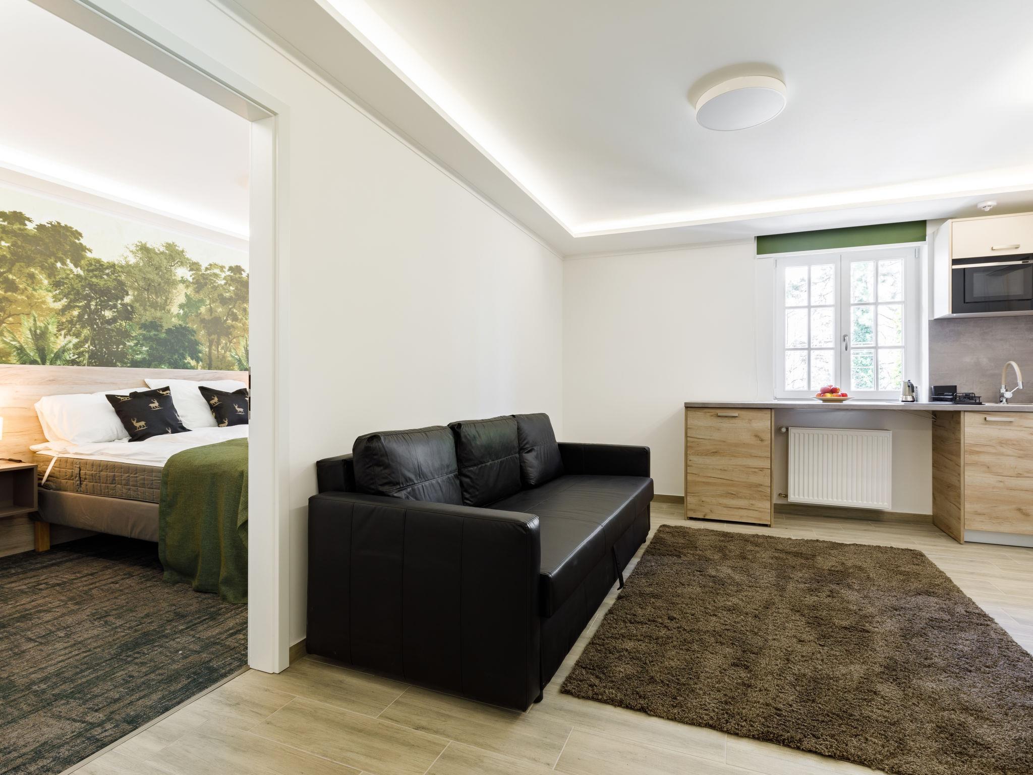 "Park Residence 19", 10-room villa on 2 levels. Beautiful and modern furnishings: open living/dining room, window onto the courtyard with 1 sofabed, dining table, kitchen corner, shower/WC and cable TV (flat screen). 1 double bedroom with 1 french bed (160 cm, length 200 cm). Studio, window onto the courtyard with 1 french bed (160 cm, length 200 cm), dining nook, kitchen corner, shower/WC and cable TV (flat screen). Open living/dining room with 1 double sofabed, dining table, kitchen corner, shower/WC and cable TV (flat screen). Exit to the terrace. 1 double bedroom with 1 french bed (160 cm, length 200 cm). Billiard room with dining table, kitchen corner, separate WC and cable TV (flat screen). Exit to the terrace. Small kitchenette (2 hot plates, microwave). Upper floor: open living/dining room with dining table, kitchen corner, shower/WC and cable TV (flat screen). 1 double bedroom with 1 french bed (160 cm, length 200 cm). Open living/dining room with dining table, kitchen corner, shower/WC and cable TV (flat screen). 2 double bedrooms, each room with 1 french bed (160 cm, length 200 cm). Open kitchen (microwave, electric coffee machine). Air-conditioning, floor heating. Solar power. Facilities: children's high chair, baby cot (extra), hair dryer. All apartments are equipped with an electric coffee maker, microwave and double hotplates.