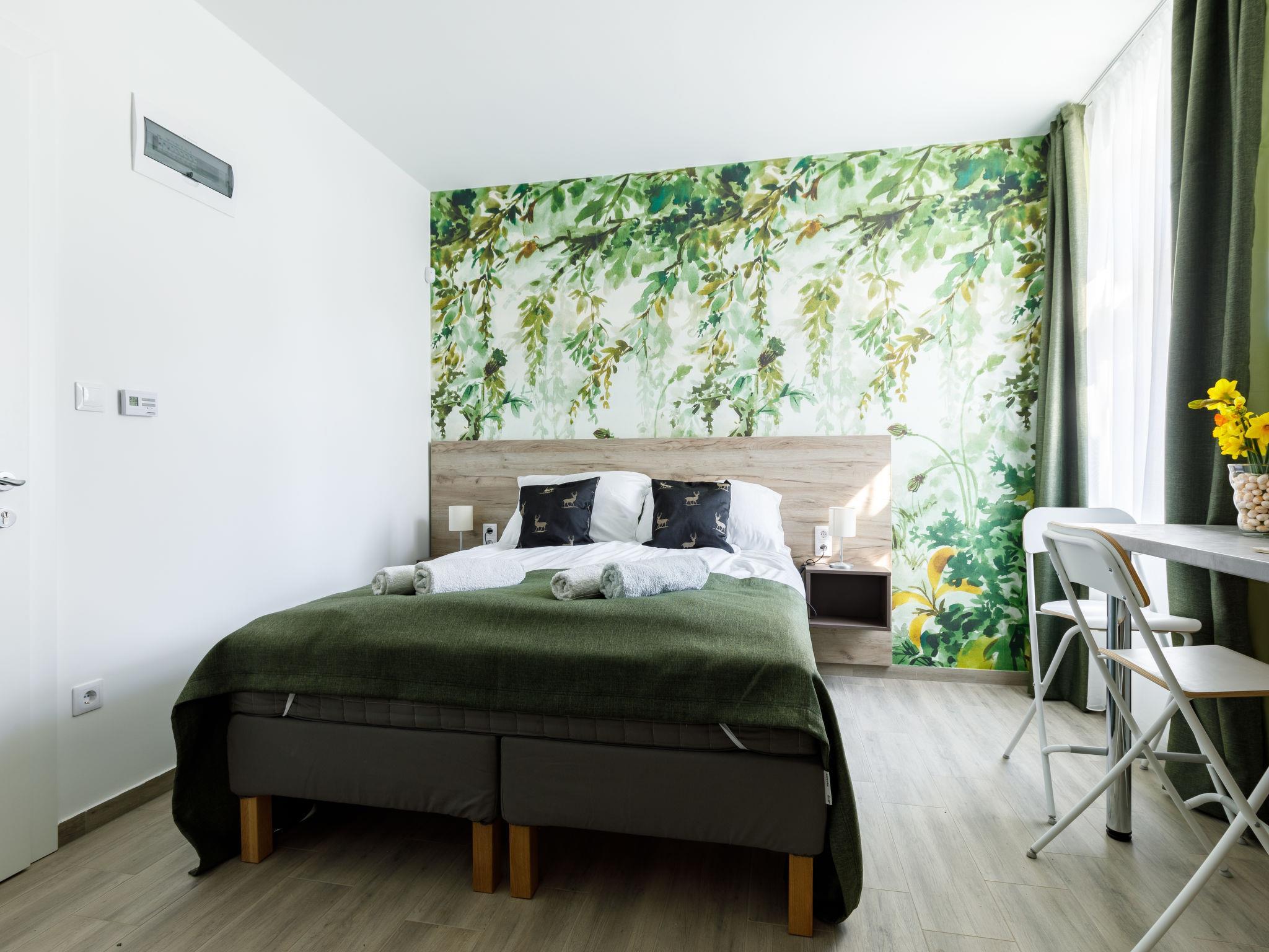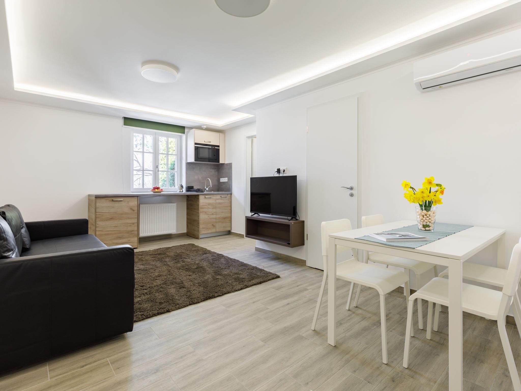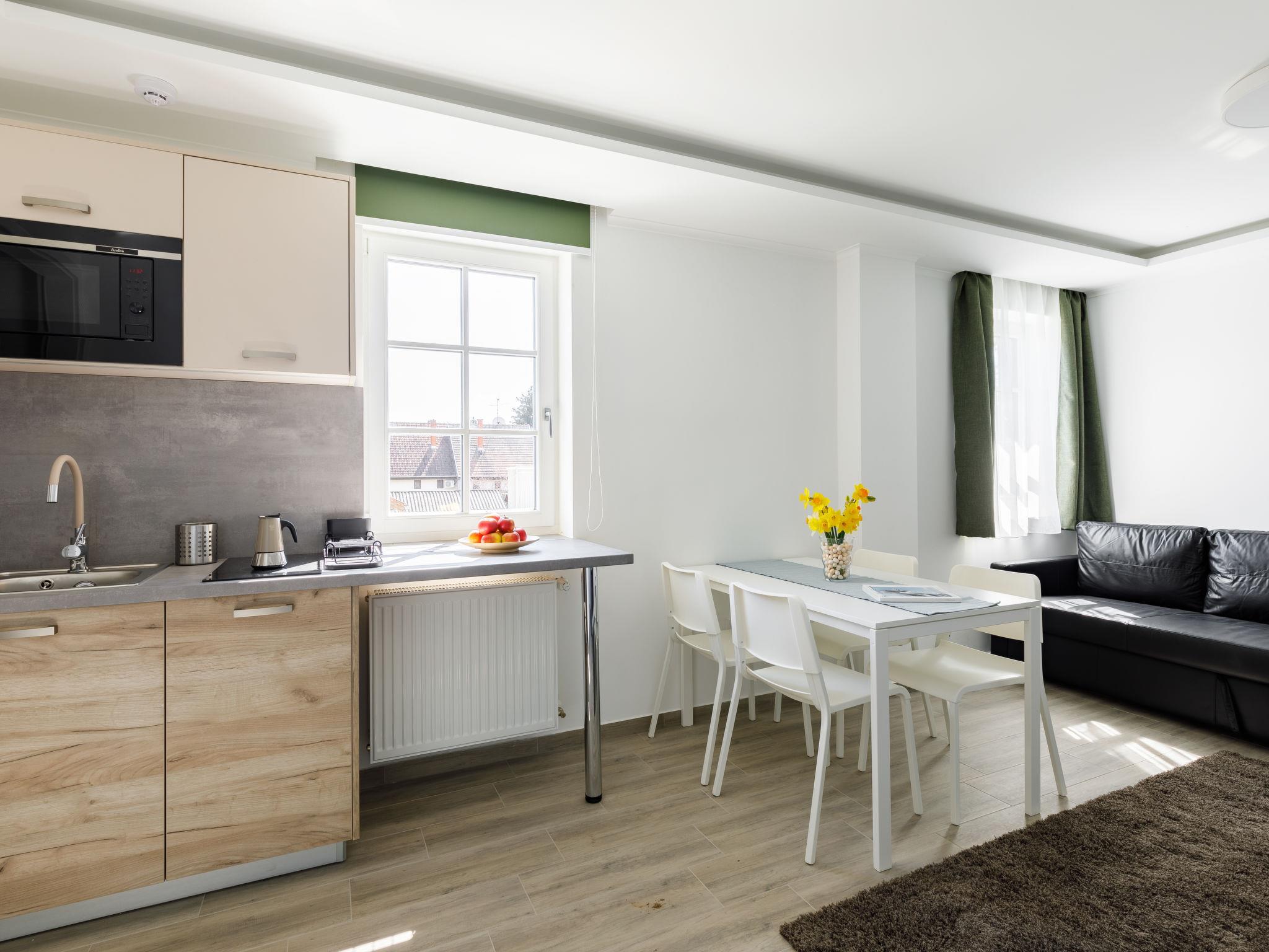 "Park Residence 12", 10-room villa on 2 levels. Beautiful and modern furnishings: open living/dining room, window onto the courtyard with dining table, kitchen corner, shower/WC and cable TV (flat screen). 1 double bedroom with 1 french bed (160 cm, length 200 cm). Studio, window onto the courtyard with 1 french bed (160 cm, length 200 cm), dining nook, kitchen corner, shower/WC and cable TV (flat screen). Open living/dining room with dining table, kitchen corner, shower/WC and cable TV (flat screen). Exit to the terrace. 1 double bedroom with 1 french bed (160 cm, length 200 cm). Billiard room with dining table, kitchen corner, separate WC and cable TV (flat screen). Exit to the terrace. Small kitchenette (2 hot plates, microwave). Upper floor: open living/dining room with dining table, kitchen corner, shower/WC and cable TV (flat screen). 1 double bedroom with 1 french bed (160 cm, length 200 cm). Open living/dining room with dining table, kitchen corner, shower/WC and cable TV (flat screen). 2 double bedrooms, each room with 1 french bed (160 cm, length 200 cm). (microwave, electric coffee machine). Air-conditioning, floor heating. Solar power. Facilities: children's high chair, baby cot (extra), hair dryer. All five apartments are equipped with electric coffee mashine, microwave and double hotplates.