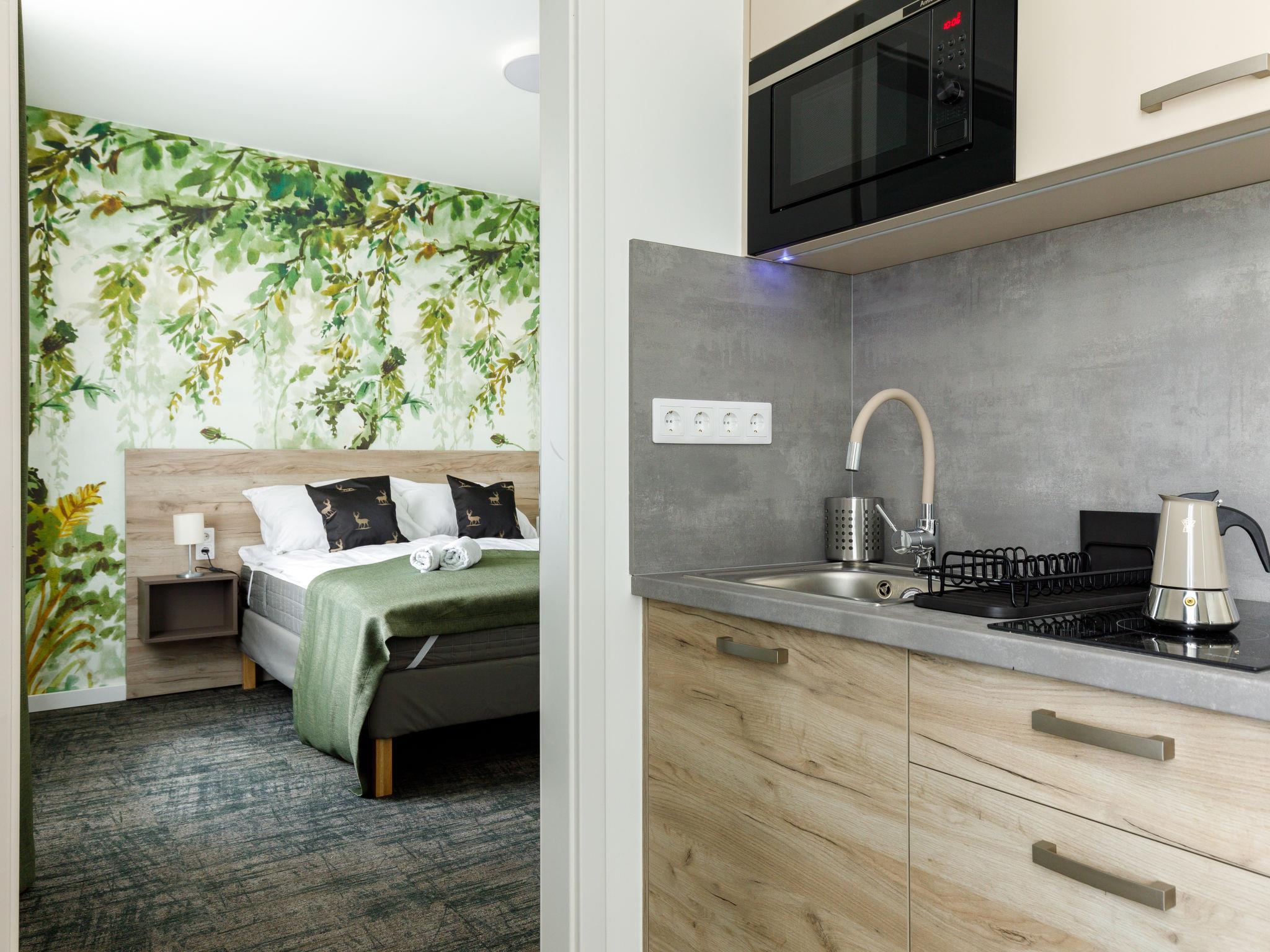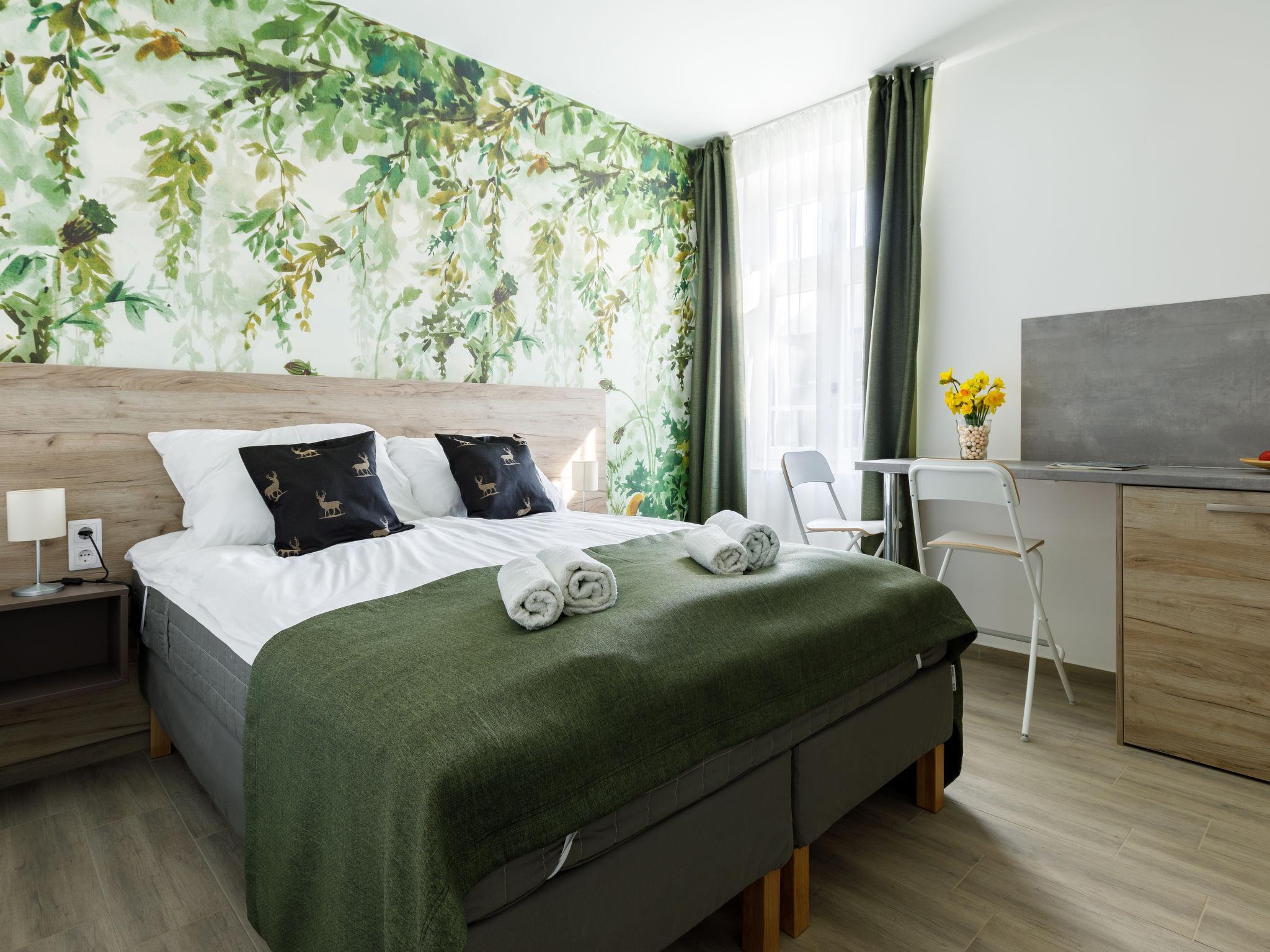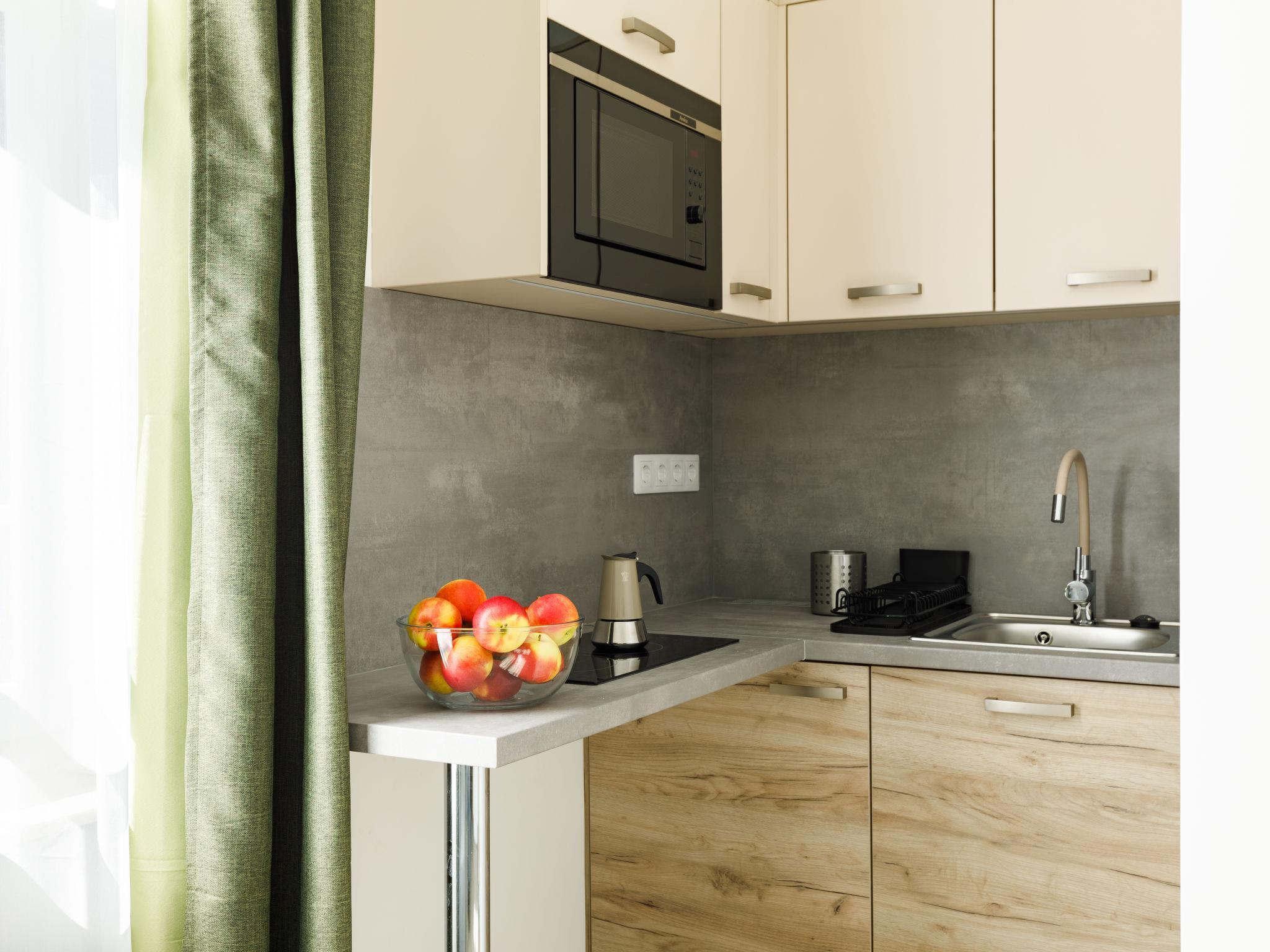 "Park Residence 12", 10-room villa on 2 levels. Beautiful and modern furnishings: open living/dining room, window onto the courtyard with dining table, kitchen corner, shower/WC and cable TV (flat screen). 1 double bedroom with 1 french bed (160 cm, length 200 cm). Studio, window onto the courtyard with 1 french bed (160 cm, length 200 cm), dining nook, kitchen corner, shower/WC and cable TV (flat screen). Open living/dining room with dining table, kitchen corner, shower/WC and cable TV (flat screen). Exit to the terrace. 1 double bedroom with 1 french bed (160 cm, length 200 cm). Billiard room with dining table, kitchen corner, separate WC and cable TV (flat screen). Exit to the terrace. Small kitchenette (2 hot plates, microwave). Upper floor: open living/dining room with dining table, kitchen corner, shower/WC and cable TV (flat screen). 1 double bedroom with 1 french bed (160 cm, length 200 cm). Open living/dining room with dining table, kitchen corner, shower/WC and cable TV (flat screen). 2 double bedrooms, each room with 1 french bed (160 cm, length 200 cm). (microwave, electric coffee machine). Air-conditioning, floor heating. Solar power. Facilities: children's high chair, baby cot (extra), hair dryer. All five apartments are equipped with electric coffee mashine, microwave and double hotplates.