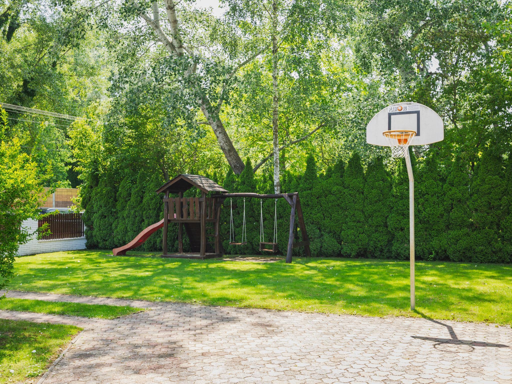 Balatonszárszó 22 km from Siófok: Beautiful semi-detached house. 1 km from the centre of Balatonszarszo, on the outskirts, 25 km from the centre of Siofok, in the residential district, 200 m from the lake, 350 m from the beach. For shared use: property 800 m2 (fenced), well-kept garden with lawn and trees. Private: basketball, children's playground (slide, swing, sandbox). In the house: air conditioning. Parking (for 2 cars) on the premises. Shop 1 km, grocery 1 km, supermarket 5 km, restaurant 300 m, bicycle rental 3 km, railway station 1 km, grass beach 200 m, thermal baths "Csiszta" 35 km. Surf school 6 km, tennis 1 km, cycle lane 10 m, children's playground 350 m, fishing possibilities 7 km. Nearby attractions: Siófok Giant Wheels 28 km, Festetics Castle 65 km, Csiszta Thermal Bath 35 km, Siófok Zoo 32 km, Kereki Dinosaurs Park 15 km. Please note: suitable for families, baby equipment on request (extra). Owner lives in separate semi-detached house. Railway line closeby.