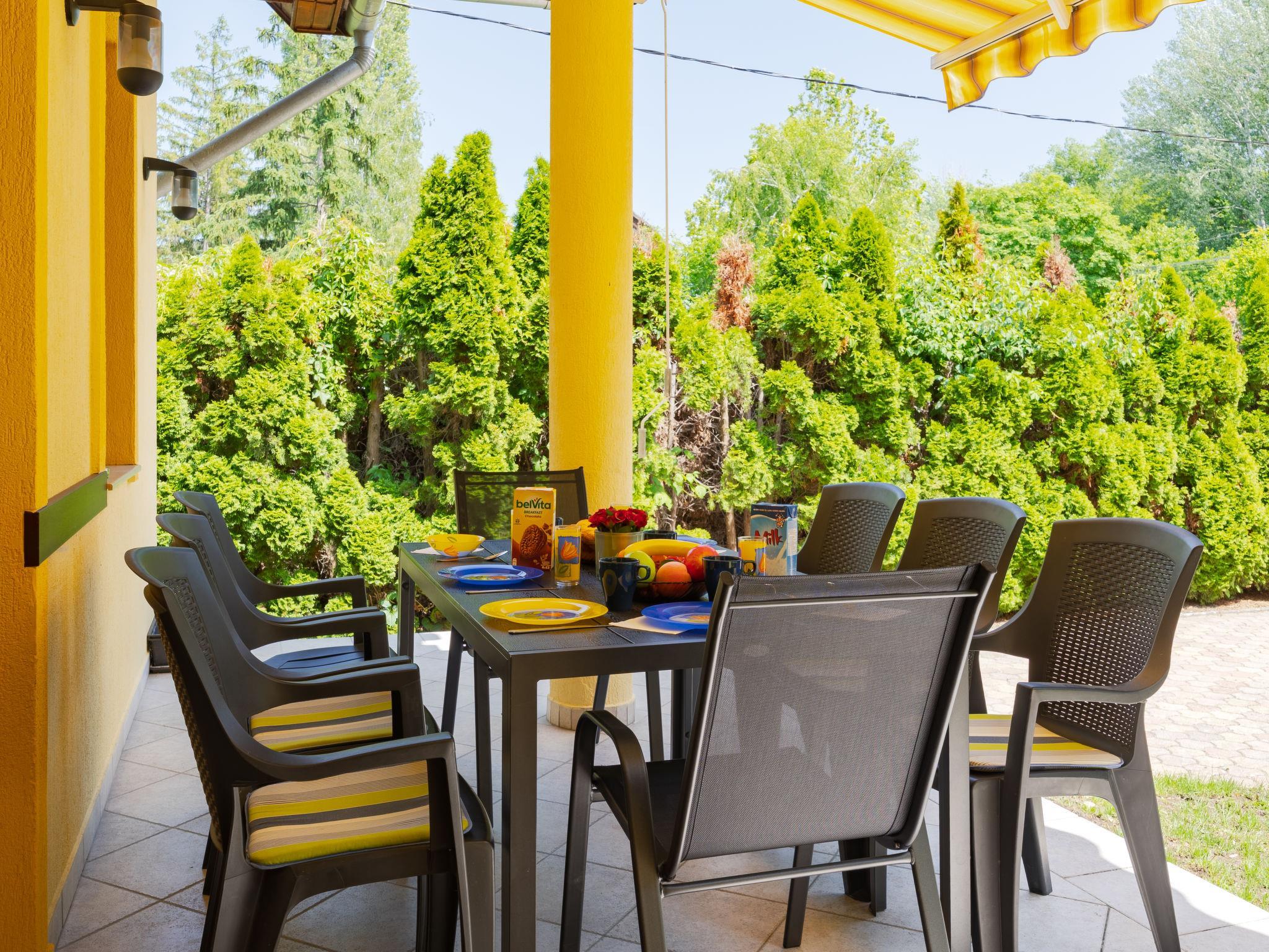 "Jókai", 6-room semi-detached house 160 m2 on 2 levels. Comfortable and cosy furnishings: living/dining room with satellite TV and air conditioning. 1 double bedroom with 1 french bed (180 cm, length 200 cm), 1 fold-away bed, digital TV and air conditioning. Exit to the terrace. 1 room with 2 beds (90 cm, length 200 cm). Open kitchen (2 hot plates, oven, toaster, kettle, microwave, freezer, electric coffee machine) with dining table, 1 fold-away bed. Shower, sep. WC. Heating, air-conditioning. Upper floor: 1 room with sloping ceilings with 2 beds (90 cm, length 200 cm). 1 double bedroom with sloping ceilings with 1 french bed (180 cm, length 200 cm), digital TV and air conditioning. Exit to the balcony. Open kitchen (oven, 2 ceramic glass hob hotplates, microwave, freezer) with dining table. Exit to the balcony. Shower, sep. WC. No heating option. Terrace. Terrace furniture, balcony furniture, covered balcony. Facilities: children's high chair, baby cot (extra). Internet (WiFi). Please note: non-smoking house. SPTPS8WH