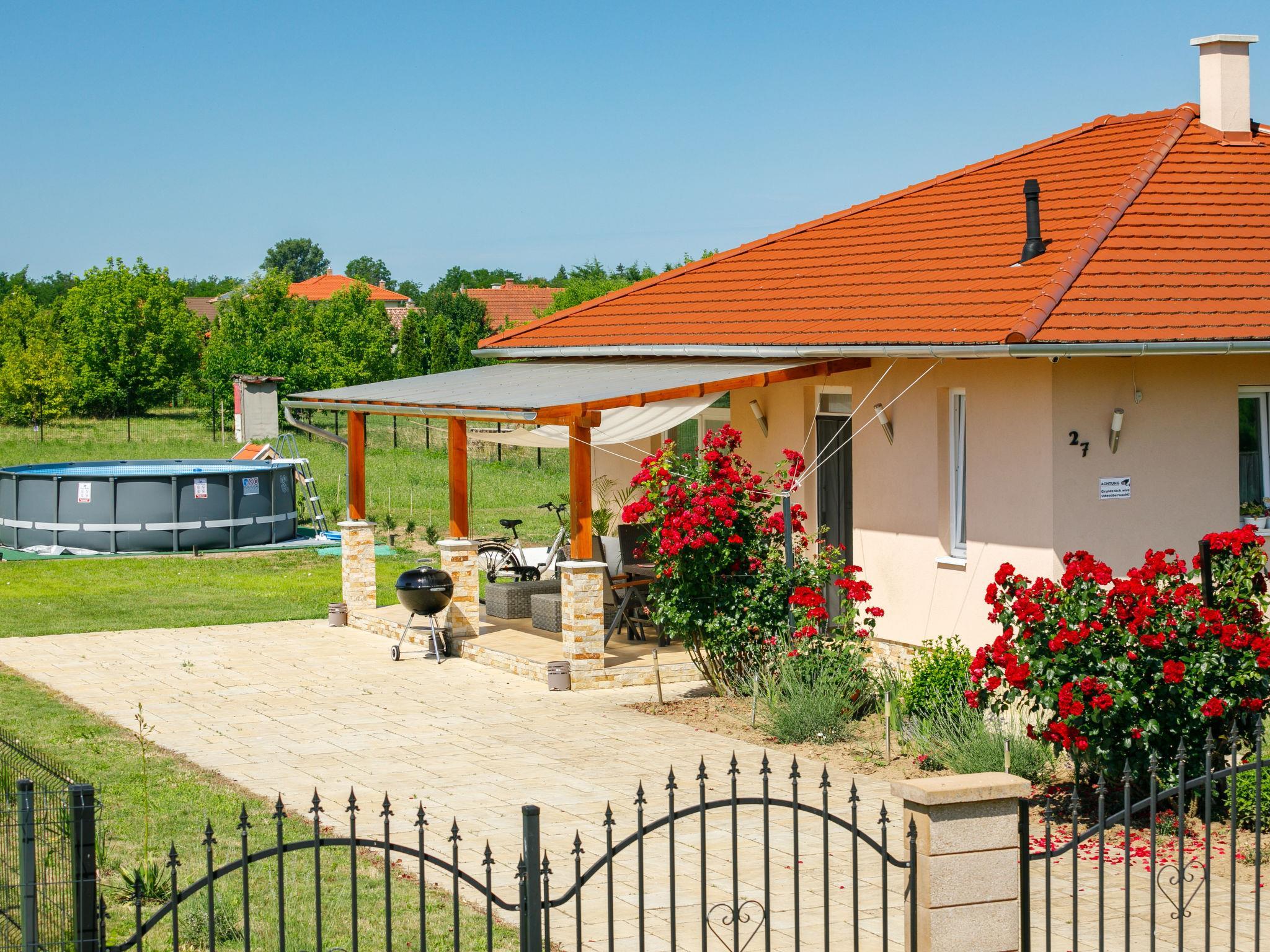 Balatonszemes 10 km from Balatonboglár: Modern, cosy single-family house "Paola", built in 2017. In a quiet position, 500 m from the lake, 1 km from the beach. Private: property (fenced), garden, swimming pool (above ground) round (5 x depth 120 cm, seasonal availability: 15.May. and 15.Sep.). In the house: WiFi. Shop 20 m, restaurant, grass beach 500 m. Children's playground 50 m.