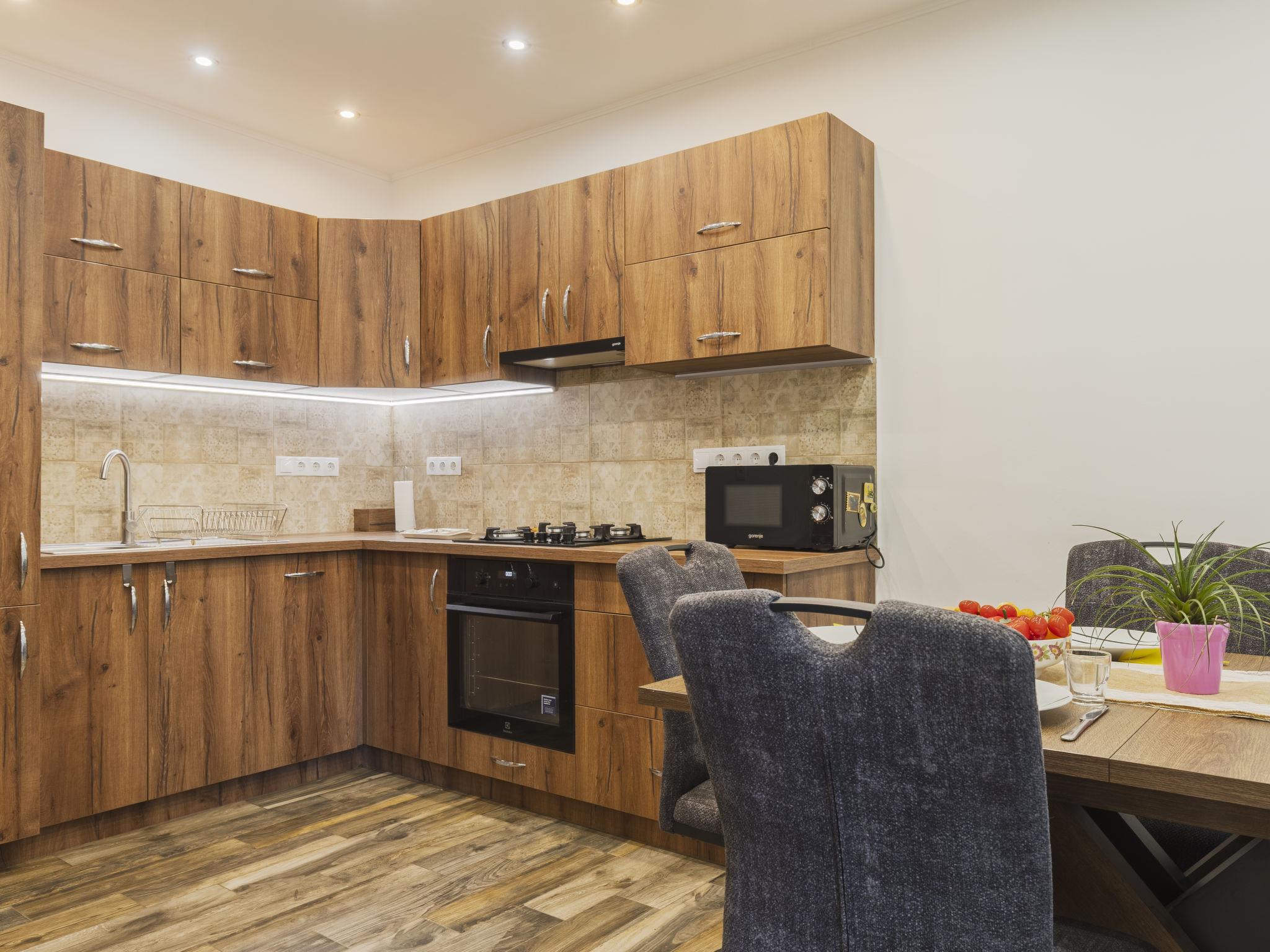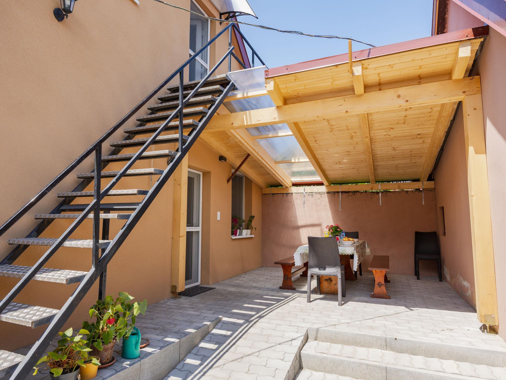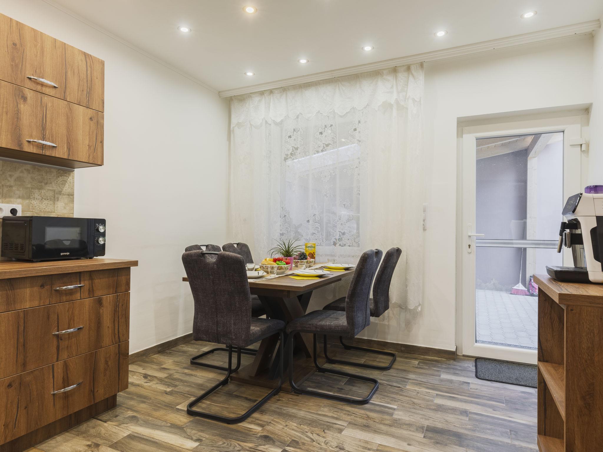 "Dalma", 4-room apartment on the ground floor. Spacious and bright, comfortable and cosy furnishings: living room with digital TV. Exit to the garden. 1 large double bedroom with 1 french bed (160 cm, length 200 cm), air conditioning. 2 large double bedrooms, each room with 1 french bed (160 cm, length 200 cm). Kitchen (oven, dishwasher, Gas stove, 4 gas rings, toaster, kettle, microwave, freezer, electric coffee machine) with dining table. Exit to the terrace. Bath/WC, sep. WC. No heating option. Facilities: mosquito net, children's high chair, baby cot (extra). Internet (WiFi).
