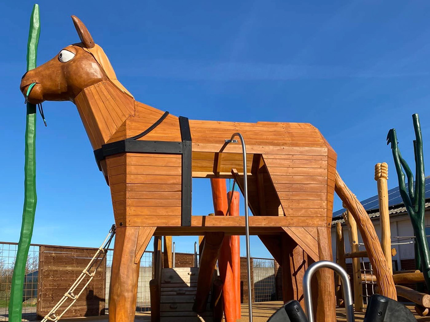 På den tematiserede legeplads ”Bondegården” kan børnene tage en tur i hestevognen, klatre i kornmarken eller svinge sig fra gulerodstårnet. Her er plads til både små og store legebørn, og gæster er velkomne til at nyde medbragt mad i området.